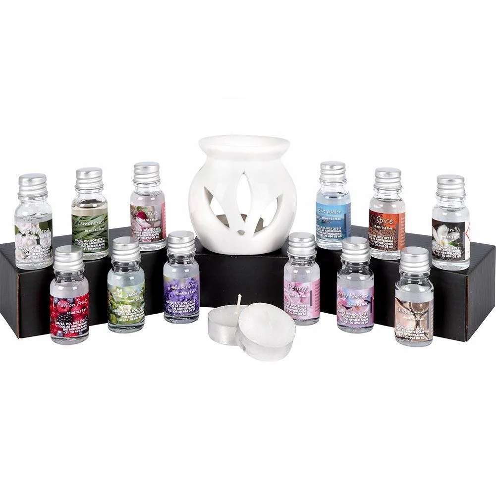 - УНИВЕРСАЛЬНЫЙ - Ароматическую горелку можно использовать для нанесения масел из набора, но можно также нагревать в ней ароматический воск. В наборе 12 ароматических масел емкостью 10 мл каждое. В набор входят ароматы с названиями: Специи, Маракуйя, Пион, Сандал, Жасмин, Гардения, Роза, Лемонграсс, Лаванда, Голубая вода, Ваниль, Вишневый цвет.
