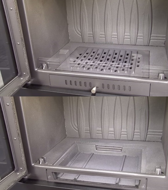 Зольник/контейнер для сбора остатков сгоревшей древесины и подвижная решетка, облегчающая удаление золы.
