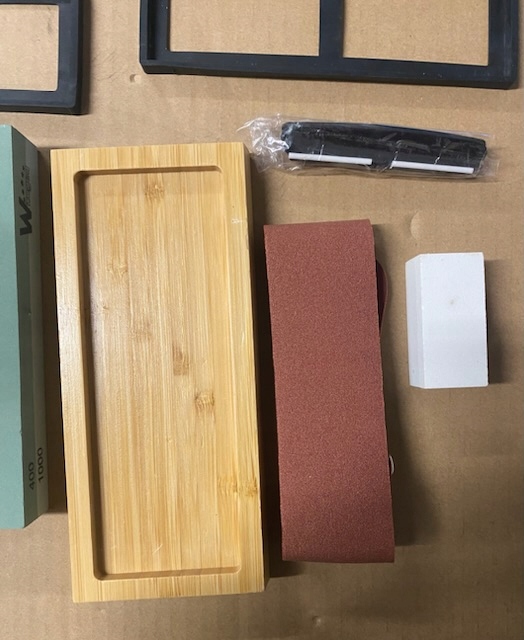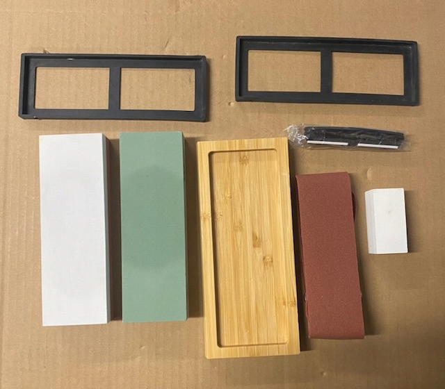 Все необходимые инструменты для заточки здесь: Входит в набор с зернистостью высочайшего качества 400. /1000 3000/ 8000 точильный камень, бамбуковая основа, угловая направляющая, выравнивающий камень,
