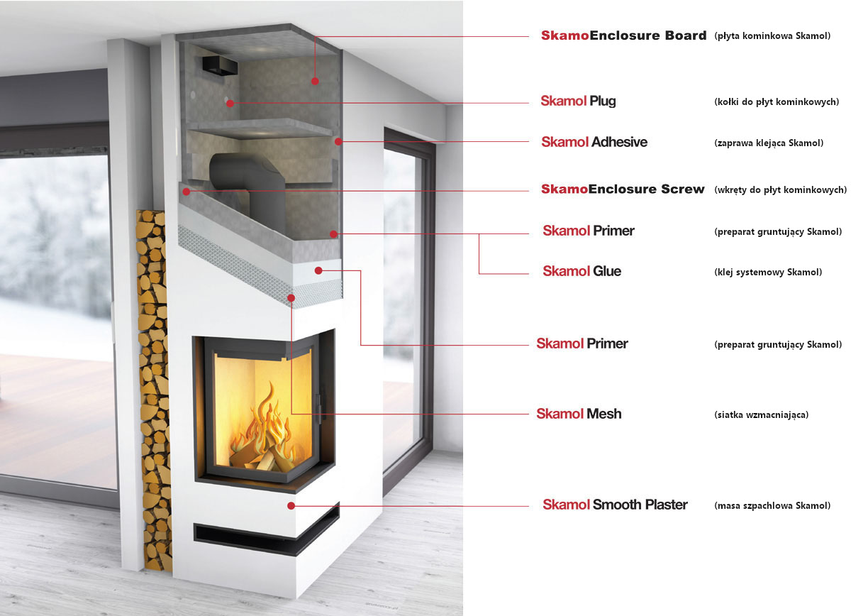 SkamoEnclosure Board — это силикатная плита (силикат кальция), которая также является конструкционным и изоляционным элементом камина. Это позволяет построить легкую и жесткую каминную конструкцию без необходимости использования дополнительной теплоизоляции. Плита прекрасно изолирует камин от окружающей среды и обеспечивает поддержание соответствующего уровня температуры внутри корпуса камина и ее безопасного значения снаружи. Это позволяет эффективно контролировать и распределять тепло в системе распределения горячего воздуха (ДГП).