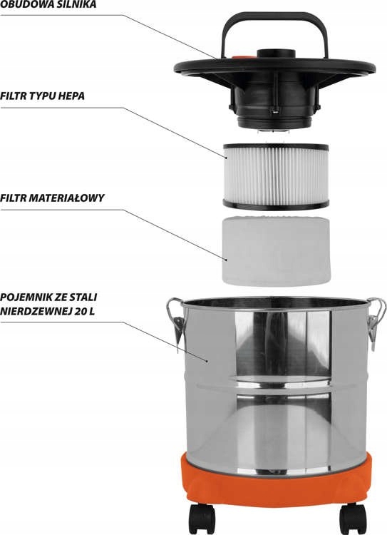 Пылесос для золы от камина или гриля, двигатель 800Вт (макс. 1000Вт), вакуум: 16кПа. - бак из нержавеющей стали емкостью 20л, - основание бака на колесах, - многоступенчатая система фильтрации: фильтр Hepa и материальный фильтр, - термостойкий всасывающий шланг длиной около 1 м с алюминиевым наконечником 23 см, - функция воздуходувки, - складная ручка для переноски устройства , - силовой кабель около 1,8 м.