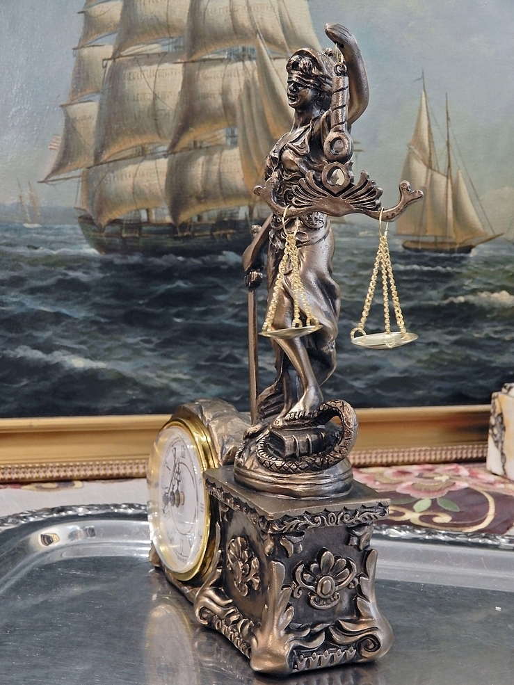 КАМИННЫЕ ЧАСЫ ТЕМИДА С МЕЧОМ И ВЕСАМИ ДЕКОРАТИВНЫЕ ДЛЯ ЮРИСТОВСКОГО КАБИНЕТА