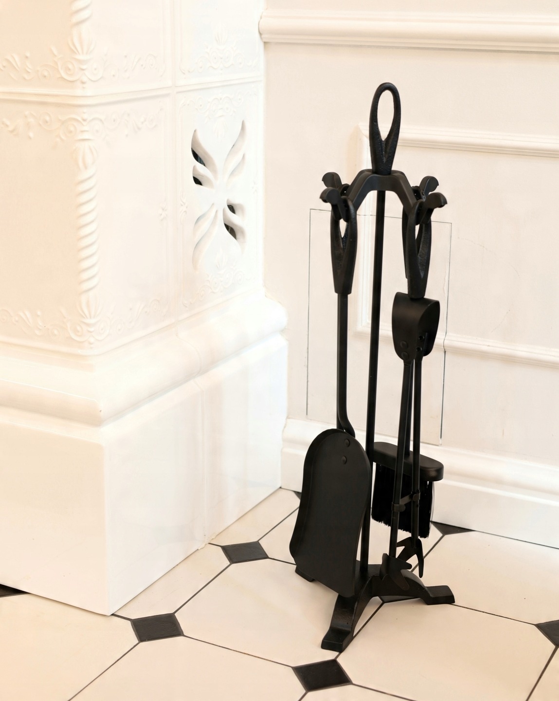 Этот набор каминных принадлежностей состоит из пяти инструментов, включая метлы, лопаты, царапины, плоскогубцы и стойки. На стенде , который помогает сохранить порядок рядом с камином