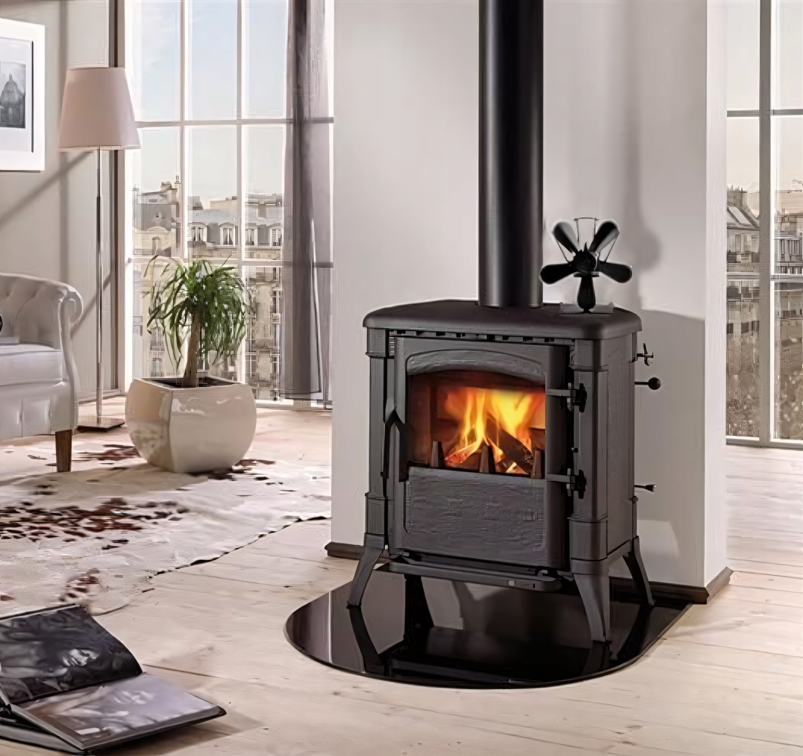 Каминный вентилятор Применяется для отдельно стоящих печей и каминов. Работает в диапазоне температур от 60°С до 345°С. Чем выше температура, тем быстрее вращаются крылья. Для максимальной эффективности вентилятор следует разместить на верхней пластине печи у заднего края, рядом с выходом дымохода.