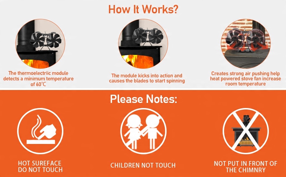 - 【Печный вентилятор с тепловым приводом】 Этот вентилятор для дровяной печи не требует внешней энергии или электричества, он использует термоэлектрическую технологию для отвода тепла. выход воздуха в помещение, что не только способствует обогреву дома, но и снижает расход топлива горелки. Просто поместите вентилятор печи на плоскую поверхность!