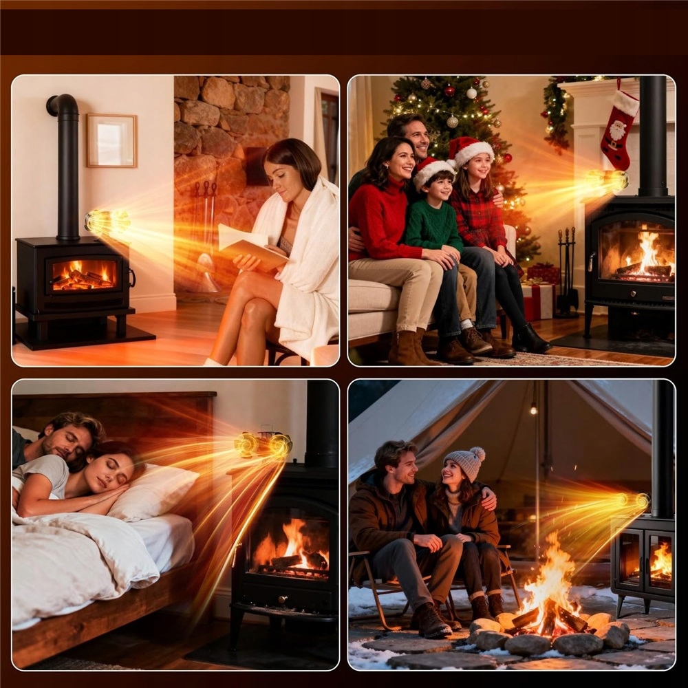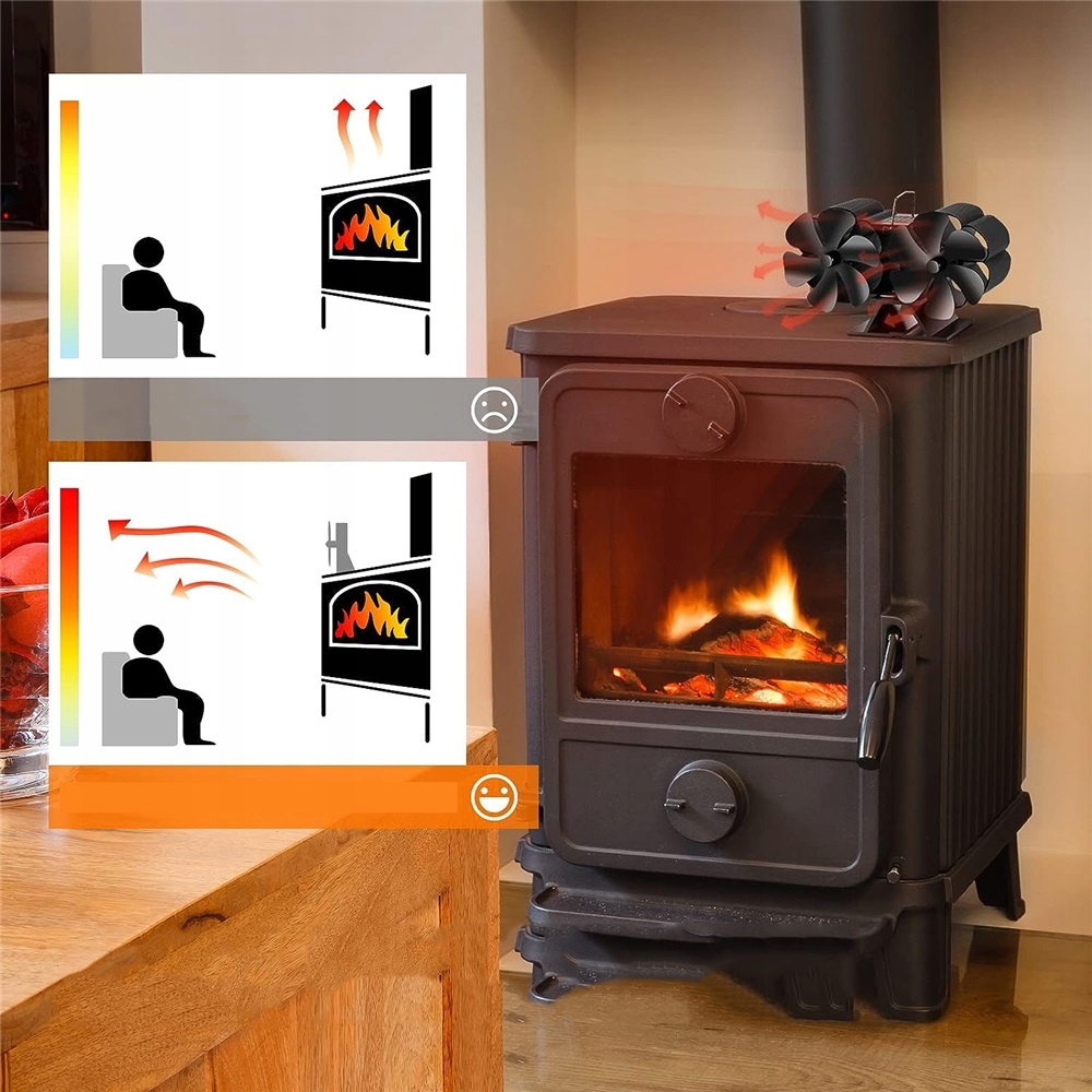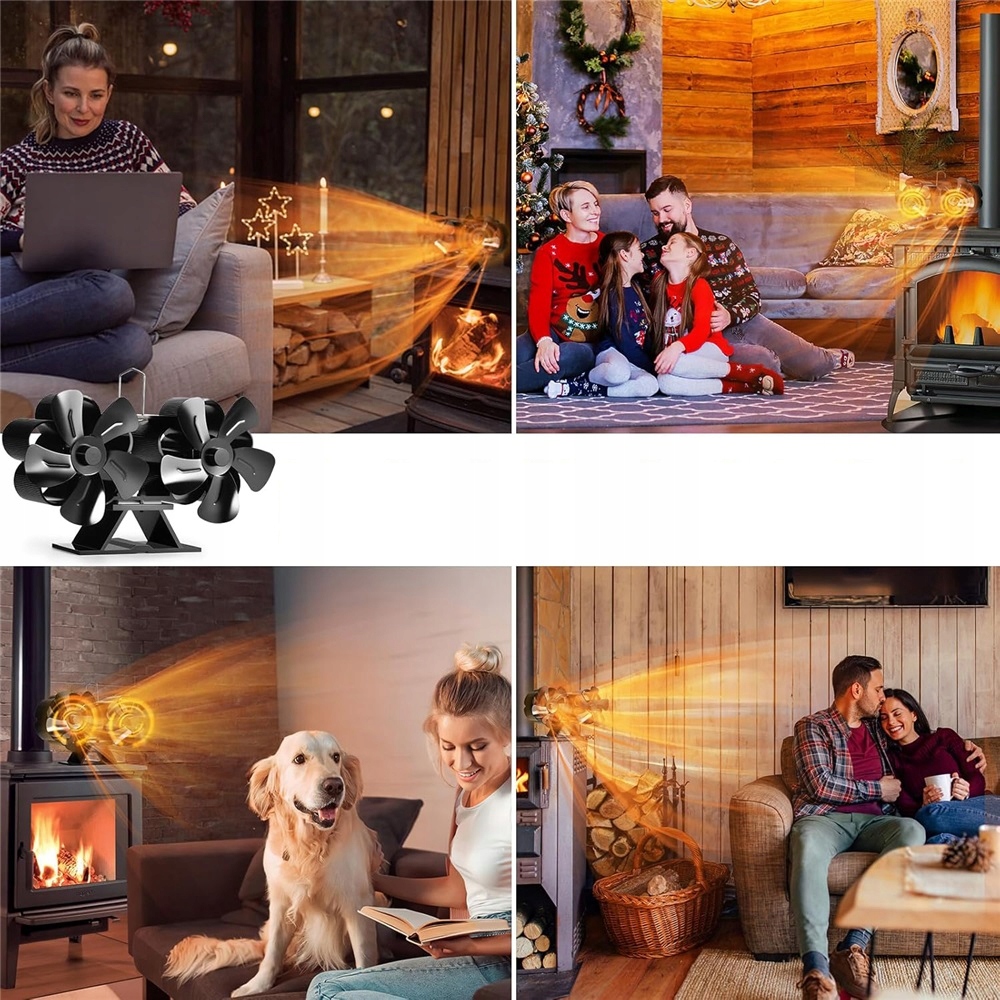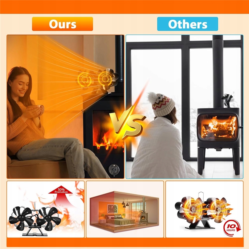 [Эффективное распределение тепла]: благодаря 12 лопастям и двойному двигателю вентилятор камина дровяной печи может равномерно распределять теплый воздух по комнате, согревая вас.