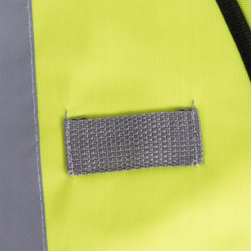 Двухцветный сигнальный жилет со светоотражающими полосами, изготовлен из 100% полиэстера, застегивается на молнию, отделан черной декоративной окантовкой.
