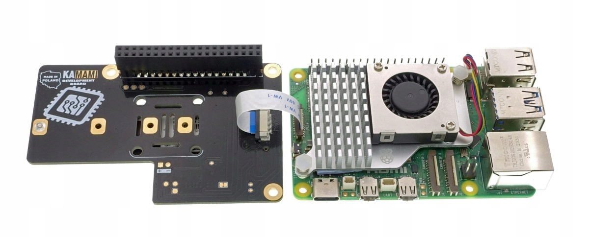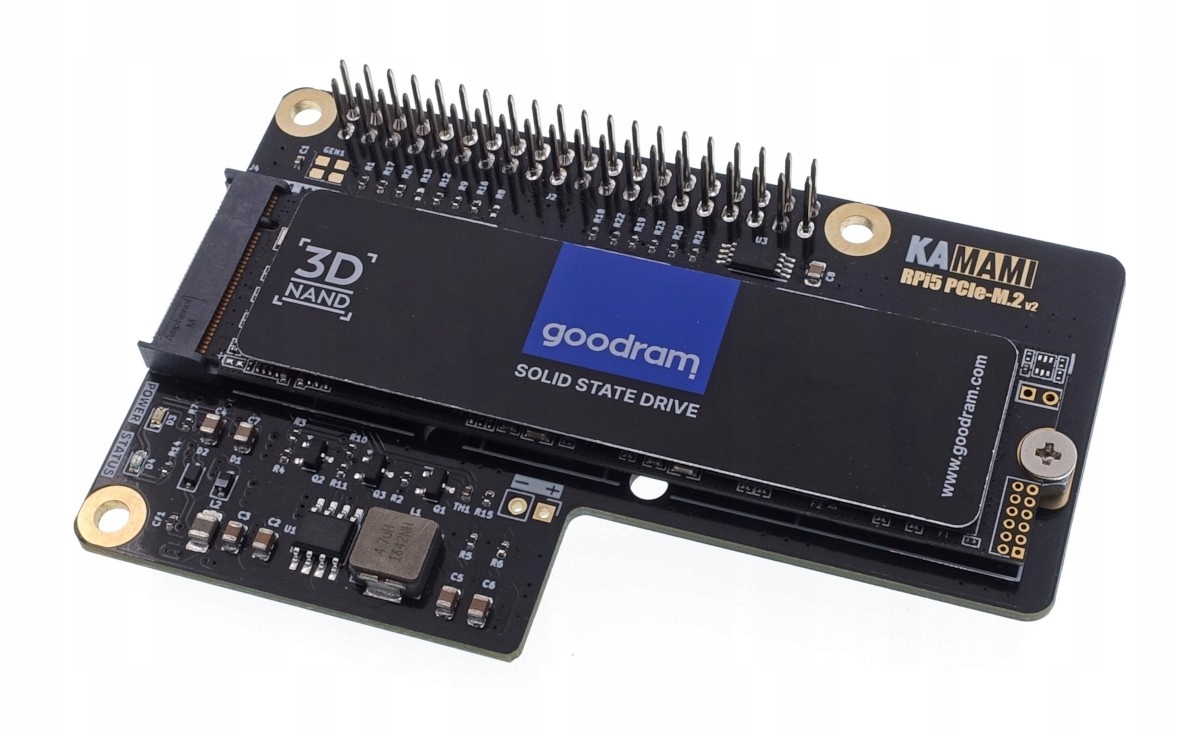 Адаптер Kamodrpi5 Pcie-M.2-это решение, которое позволяет легко соединить SSD NVME SSD с M.2 M-Connector с Raspbry Pi PI 5. Установка дисков с популярным размером 2280, а также меньшими вариантами: 2260, 2242 и 2230. Он разработан таким образом, чтобы он занимал стандартное пространство, предназначенное для модулей расширения шляп, но в то же время не ограничивает возможность использования нагрева с фанатом, посвященным Raspberr 40-контактная лента GPIO и FFC 16/0,5 (также возможно подключить только с использованием ленты FFC). Адаптер загружает источник питания непосредственно с компьютера Raspberry Pi 5, поэтому рекомендуется использовать источник питания для Raspberry Pi 5 с соответствующими параметрами - не менее 3 A, при 5,1 В .. Индикаторы в форме светодиодов, передающих сигнализацию правильного источника питания и активности диска, позволяют пользователю контролировать статус работы. Raspberry Pi 5