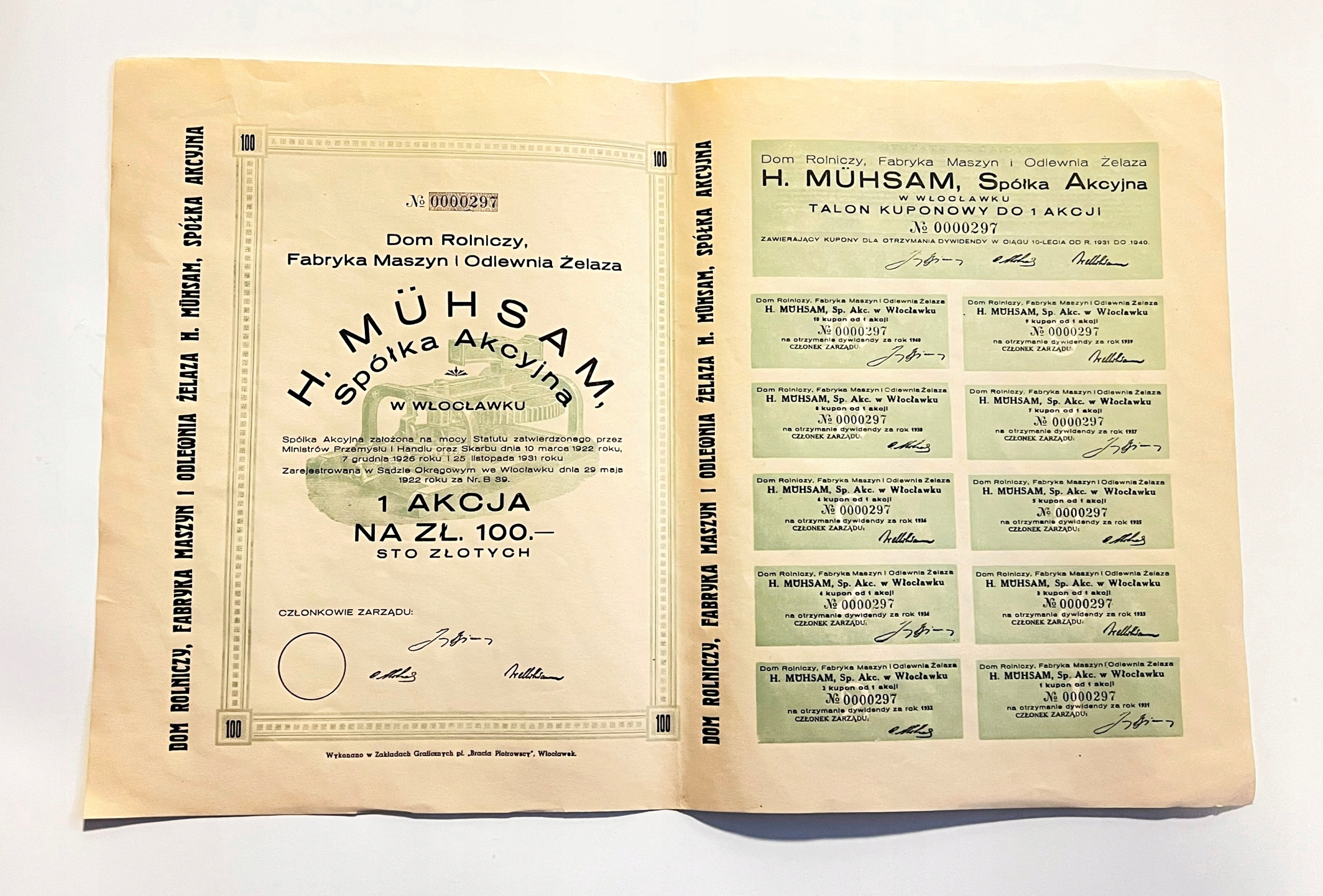 Г. Мухсам, Кампания за 100 злотых, Сельскохозяйственный дом, Машинный завод и Чугунный завод Влоцлавек.