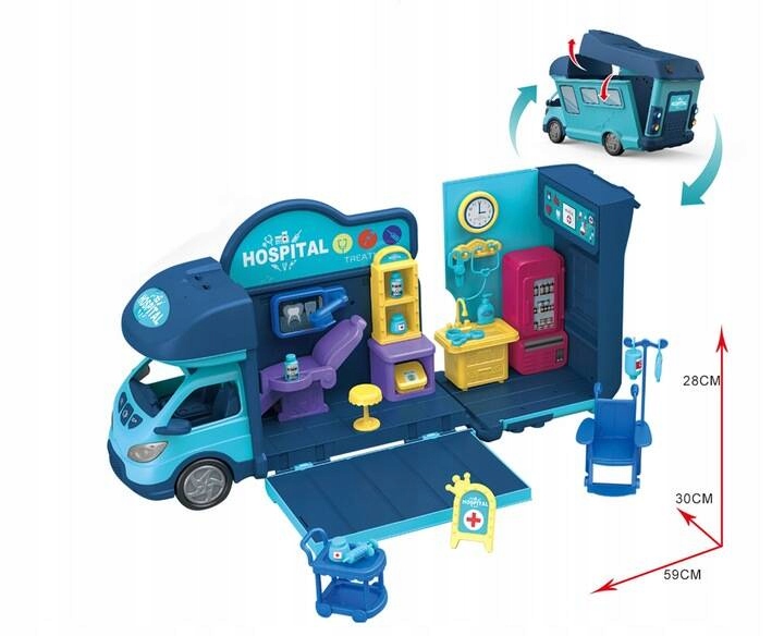 - богатое оборудование : на автодоме содержится много аксессуаров, в том числе: стоматологическое кресло, коляска медицины, гардероб с лекарственными средствами и множество других элементов, благодаря которого дети могут устроить интерьеры в соответствии со своими собственными идеями и создавать удивительные истории.