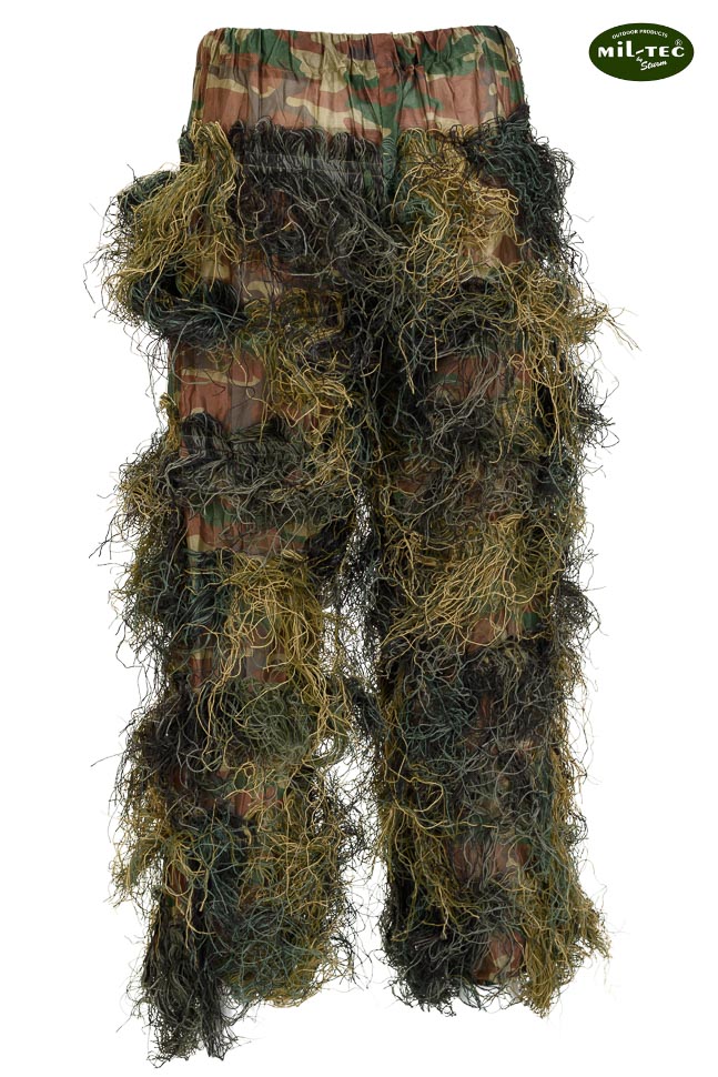 Комплексный снайперский маскалат в лесном камуфляже, 4 предмета. Создан специалистами для снайперов. Также идеально подходит для охотников и любителей пейнтбола или ASG. Его эффективность оценила элита специальных подразделений по всему миру. В настоящее время он используется большинством крупных армий. Комплект состоит из брюк, толстовки, шапки/капюшона с москитной сеткой, камуфляжа для оружия, чехла и лямок. Маскировочный костюм представляет собой тысячи пучков разноцветной пряжи «бахрома», пришитой к специальной камуфляжной одежде – выглядит очень естественно. Маскалат дополнительно размывает четкий и характерный человеческий силуэт на фоне окружающей обстановки. Хотя существует множество современных камуфляжей, маскировочный костюм является наиболее эффективным и универсальным. Маскировочный костюм обеспечивает отличную маскировку в полевых условиях независимо от факторов: времени года, цвета фона и условий освещения. Маски в очень широком диапазоне цветов фона и в переменных условиях тени. Сделано в системе «Anti Fire», которая задерживает и ограничивает распространение огня. Материалы полностью устойчивы к гниению и плесени, быстросохнут и устойчивы к УФ излучению. Изготовлен из прочного, дышащего материала и плотной сетки, которая отлично отводит тепло и пар тела наружу (предотвращает перегрев). Чрезвычайно удобный, свободный крой - свобода движений в различных положениях для стрельбы. На голову надевается шапка/капюшон с москитной сеткой для глаз и дополнительной маской для лица, шеи, затылка и ушей. Шапка (верхняя часть и поля) из водонепроницаемой ткани, предотвращающей затопление головы водой во время дождя. Толстовка застегивается на бесшумные кнопки и имеет резинку на талии, позволяющую подогнать ее под различные силуэты. Специальные прорези обеспечивают доступ к карманам под камуфляжем. Нижний край толстовки закреплен широким подолом. Свободные брюки с вшитой широкой резинкой и дополнительной регулируемой кулиской на талии. Застежки-молнии на штанинах позволяют надевать их, не снимая обувь. В нижней части штанин пришиты эластичные ленты, которые скрывают обувь и предотвращают скатывание ног и предотвращение наступления на них. Дополнительная лента Ghillie для маскировки оружия, эластичная резина с вшитыми «бахромой» позволяет быстро, качественно и надежно замаскировать оружие. Ремни облегчают скатывание маскилата. В комплект входит компактный чехол с ручкой для транспортировки из нейлоновой сетки.