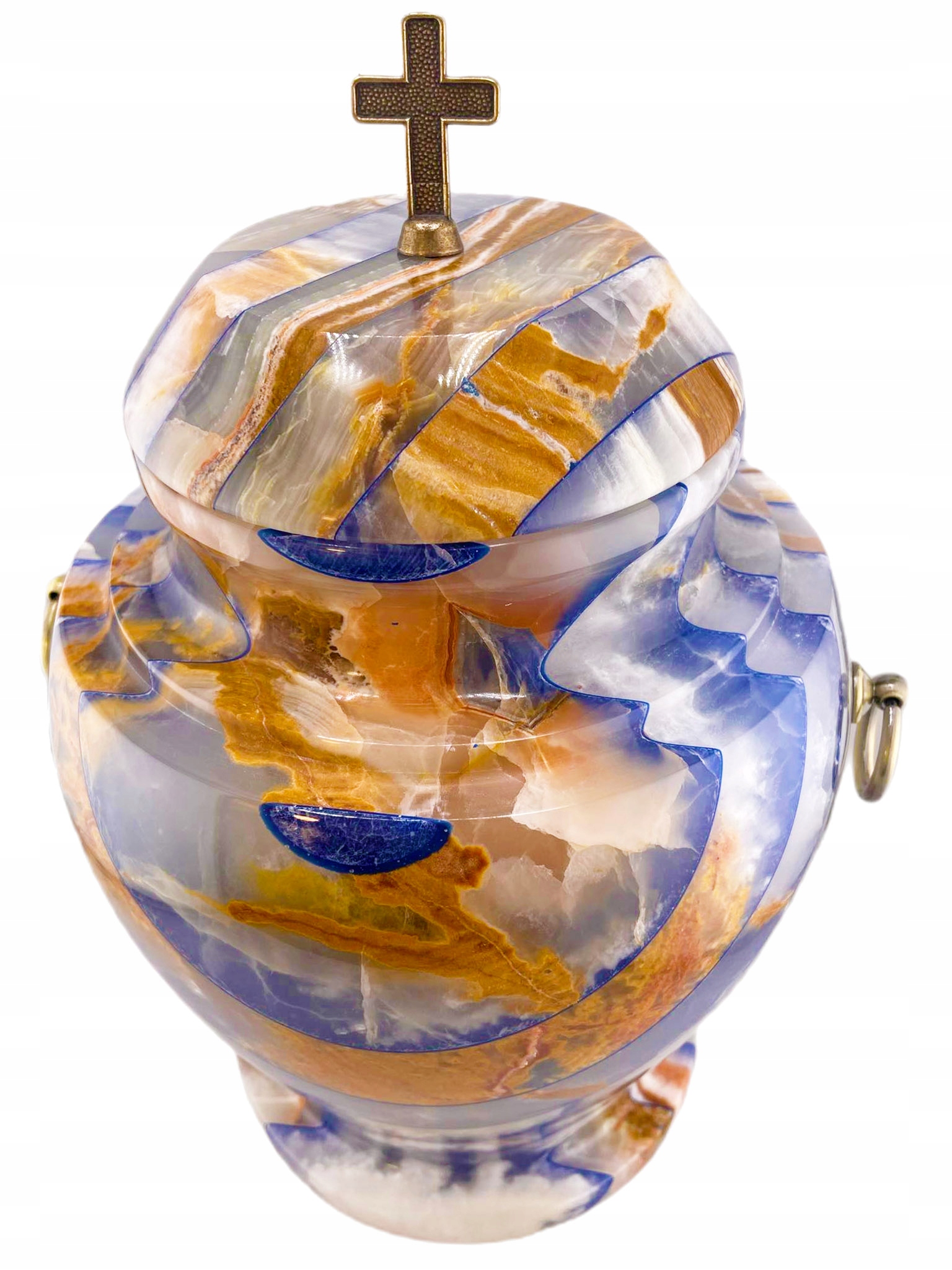 Положительная урна с высоким глянком, украшенное золотым крестом наверху и позолоченными ручками. Каменная урна чрезвычайно прочная и в то же время очень элегантная.