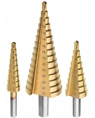 Постепенные конические учения для пластикового деревянного металла. Наземная тренировка из стали с высокой скоростью (HSS), покрытая титановым покрытием, самые тонкие листы без предварительного бурения, без заусенцев, не придерживаясь чипсов к тренировке