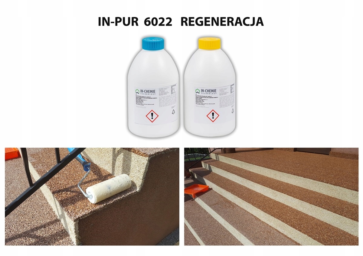 IN-PUR 6022 РЕГЕНЕРАЦИЯ Регенеративная смола для ковров из камня. Очень важной процедурой является обновление поверхности каменного ковра в течение 2–4 лет после укладки пола. Этот период зависит от солнечного света и материала, используемого подрядчиком, и может варьироваться. Мы настоятельно рекомендуем регенерировать поверхность, как только мы заметим выцветание и потерю цвета или рассыпание заполнителя с поверхности каменного ковра. Чтобы каменный ковер не разрушался слишком быстро, рекомендуется использовать регенеративную смолу сразу после изготовления каменного ковра. При этом помните, что данную процедуру проводят летом, когда температура и влажность воздуха благоприятны для регенерации поверхности. Пол из каменного ковра должен быть сухим, включая нижележащий бетонный пол, чтобы в порах и щелях каменного ковра не оставалось воды и влаги. Влага в заполнителе может привести к появлению белого налета на регенерированной поверхности и придания полу неприглядного вида