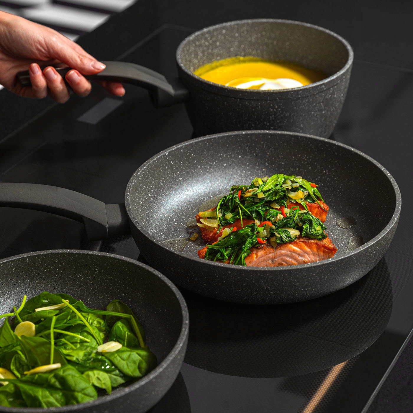 каменная сковорода лава с использованием 5-слойного покрытия, содержащего минералы внутри, что делает сосуд твердым, очень прочным и устойчивым к повреждению. Дно со свойствами, не засуряющими, позволяет готовить посуду, используя минимальное количество жира. Правильная толщина и высота сковороды гарантируют идеальное распределение тепла во время жарки, тушения и отопления. Подходит для всех видов плит.