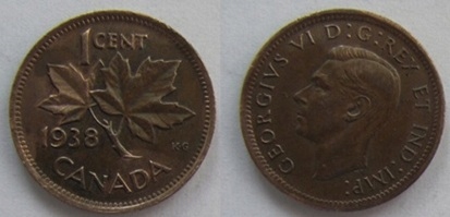 Канада 1 цент 1938 года.