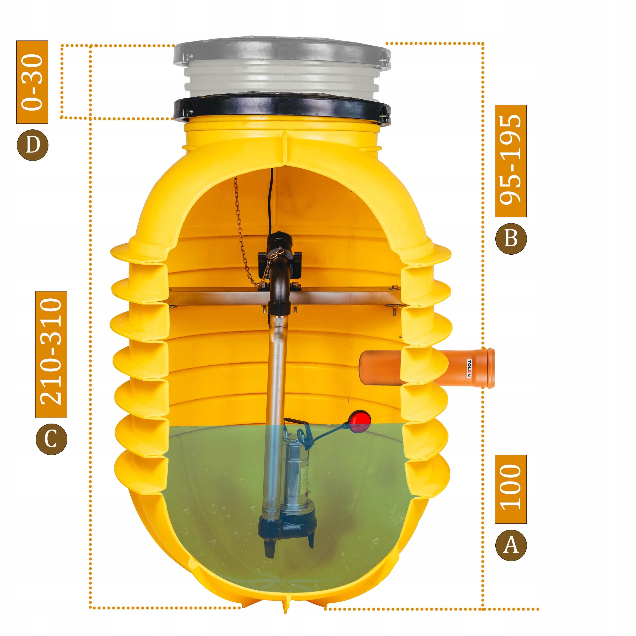 Наименьшая высота насосной станции составляет 210 см, что обеспечивает достаточно места для размещения оборудования и обеспечивает эффективную работу. Максимальная высота, которую мы можем использовать, — 310 см, размер C на рисунке. Дополнительно воротник можно регулировать, что позволяет подогнать его высоту под конкретную местность. Благодаря этой функции можно легко совместить верхнюю часть насосной станции с окружающей средой, что способствует эстетической и эргономической адаптации конструкции к окружающей среде.