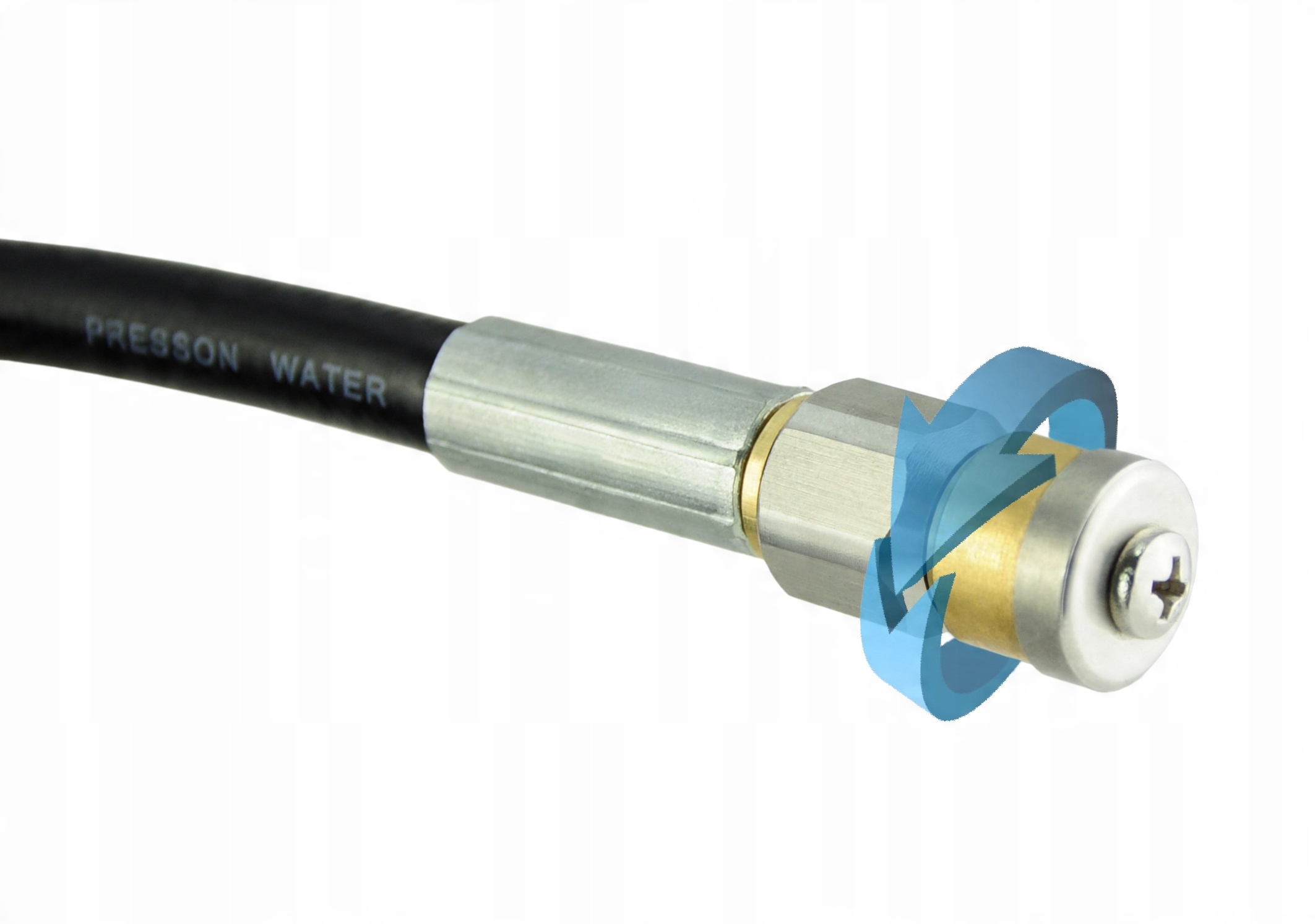 Шланг оснащен вращающейся турбонасадкой с 3 отверстиями, направленными назад. Благодаря специальной конструкции выходные отверстия форсунок вращаются вокруг собственной оси на 360°. Таким образом внутренняя поверхность трубы очищается равномерно по всей окружности, не оставляя непромытых мест. По сравнению со стандартными форсунками, которые моют трехточечными струями только узкую, концентрированную зону (с углом 20° каждая), форсунки PRESSON гарантируют до 5 раз большую эффективность мытья и очистки поверхности.