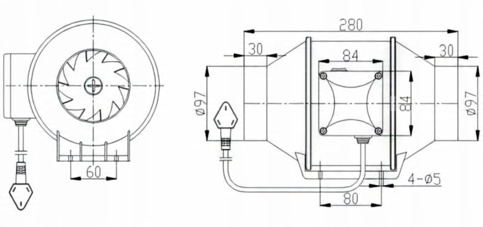 ДВУХСКОРОСТНОЙ КАНАЛЬНЫЙ ВЕНТИЛЯТОР С ПЕРЕКЛЮЧАТЕЛЕМ И КАБЕЛЕМ, ЗАКОНЧЕННЫМ ЗАГЛУШКОЙ