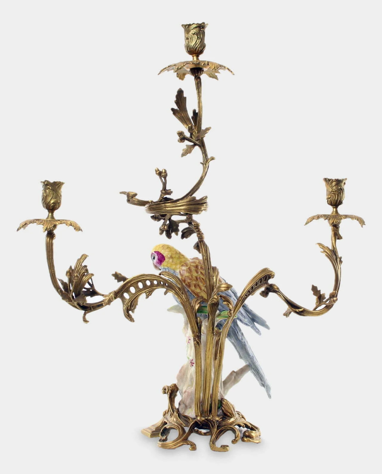 Уникальный, большой канделяба с тремя бронзами и фарфором на 3 свечах. Красиво сделано очень точно, с вниманием к наименьшим деталям. Основание с фигурой попугая, сидящего на багажнике, глядя вправо. Богато украшен и ручной. У него много красивых деталей. Это производит огромное эстетическое впечатление и имеет вечный стиль. Подходит для многих интерьеров, в качестве украшения свадебных столов или вестибюля отеля.