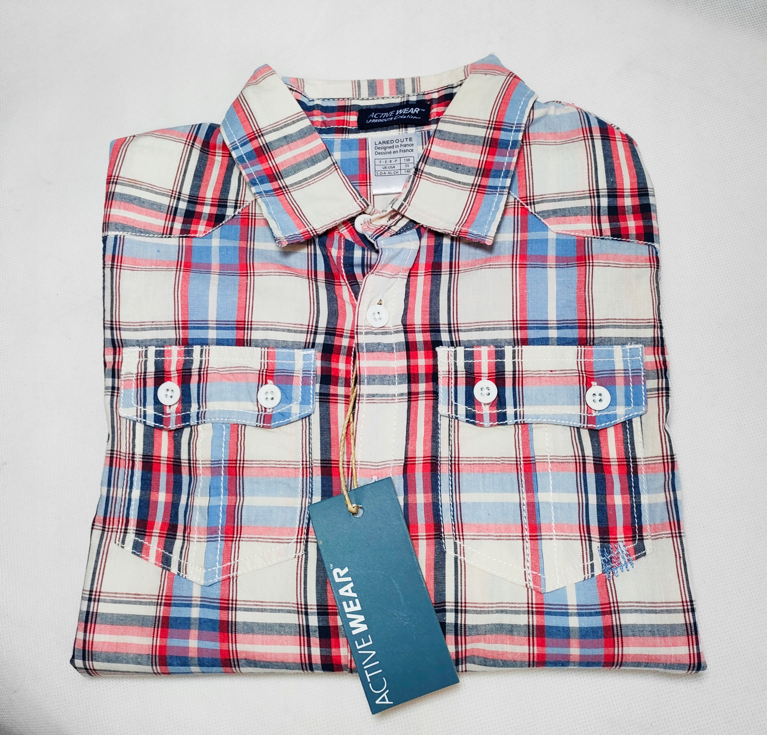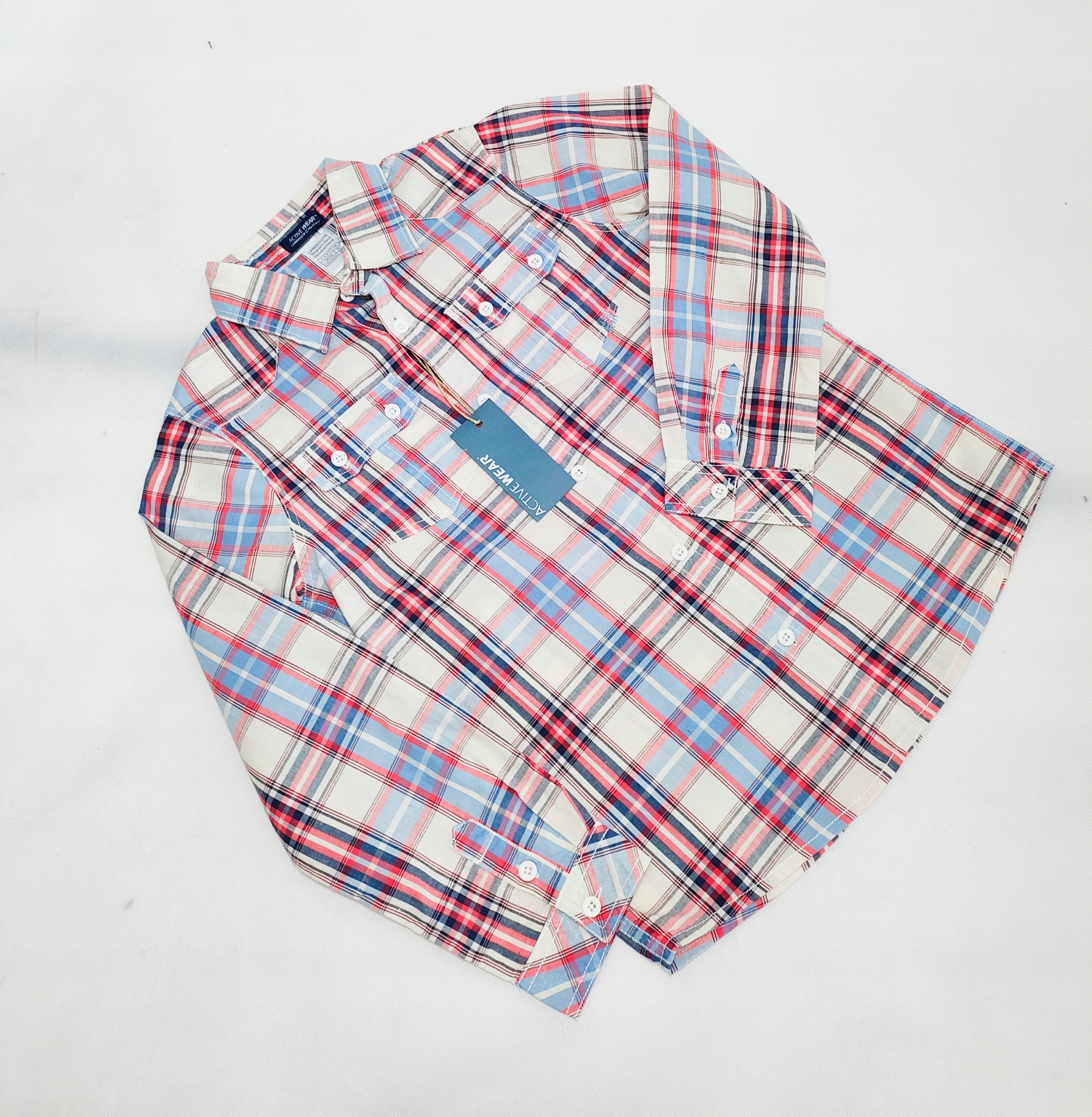 Клетчатая детская рубашка. Длинная рубашка, воротник и две пуговицы, прикрепленные к пуговицам на груди. Закрепленные кнопками. Новый продукт в оригинальной упаковке производителя.