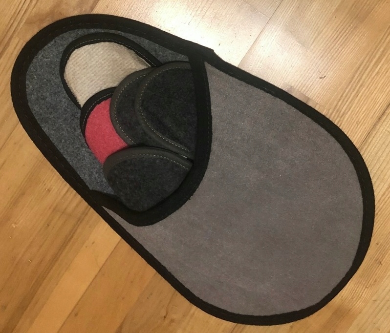 Тапочки упакованы в случайном порядке, разных цветов. Основной карман (большая тапочка) серого цвета, как на картинке.