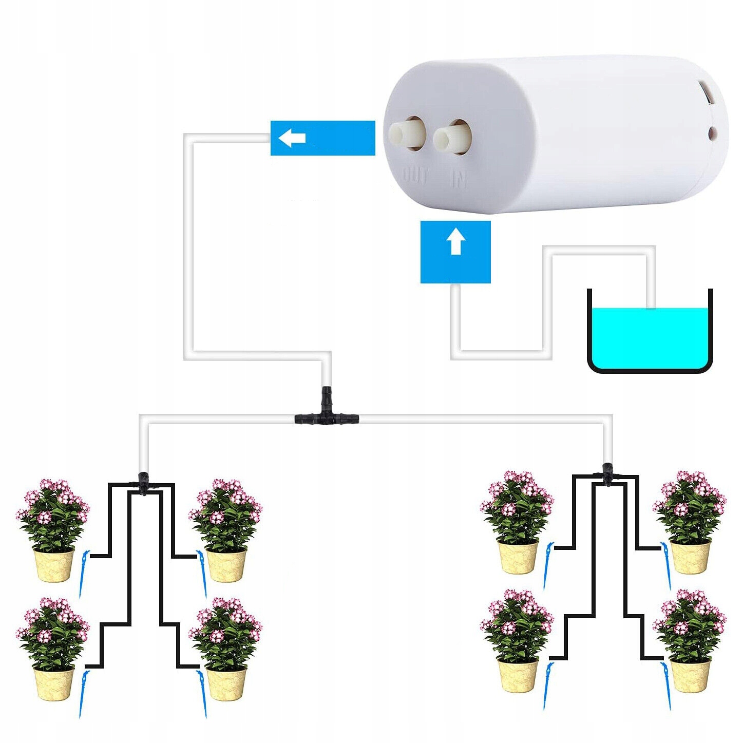 - Кран не требуется и обеспечивает защиту от нехватки воды. Он может автоматически поливать растения и прекращать работу, когда вода заканчивается, не повреждая насос и не создавая опасности.