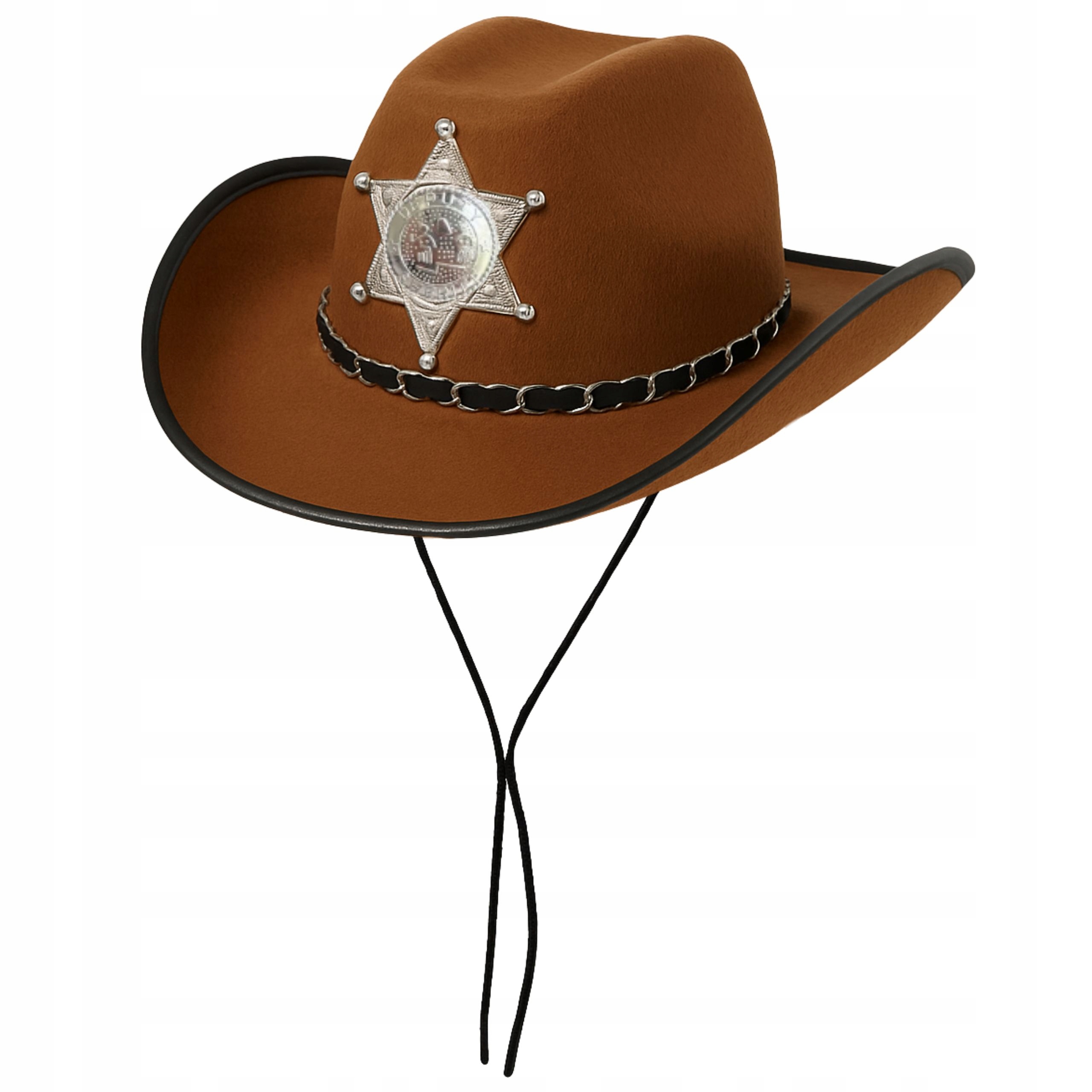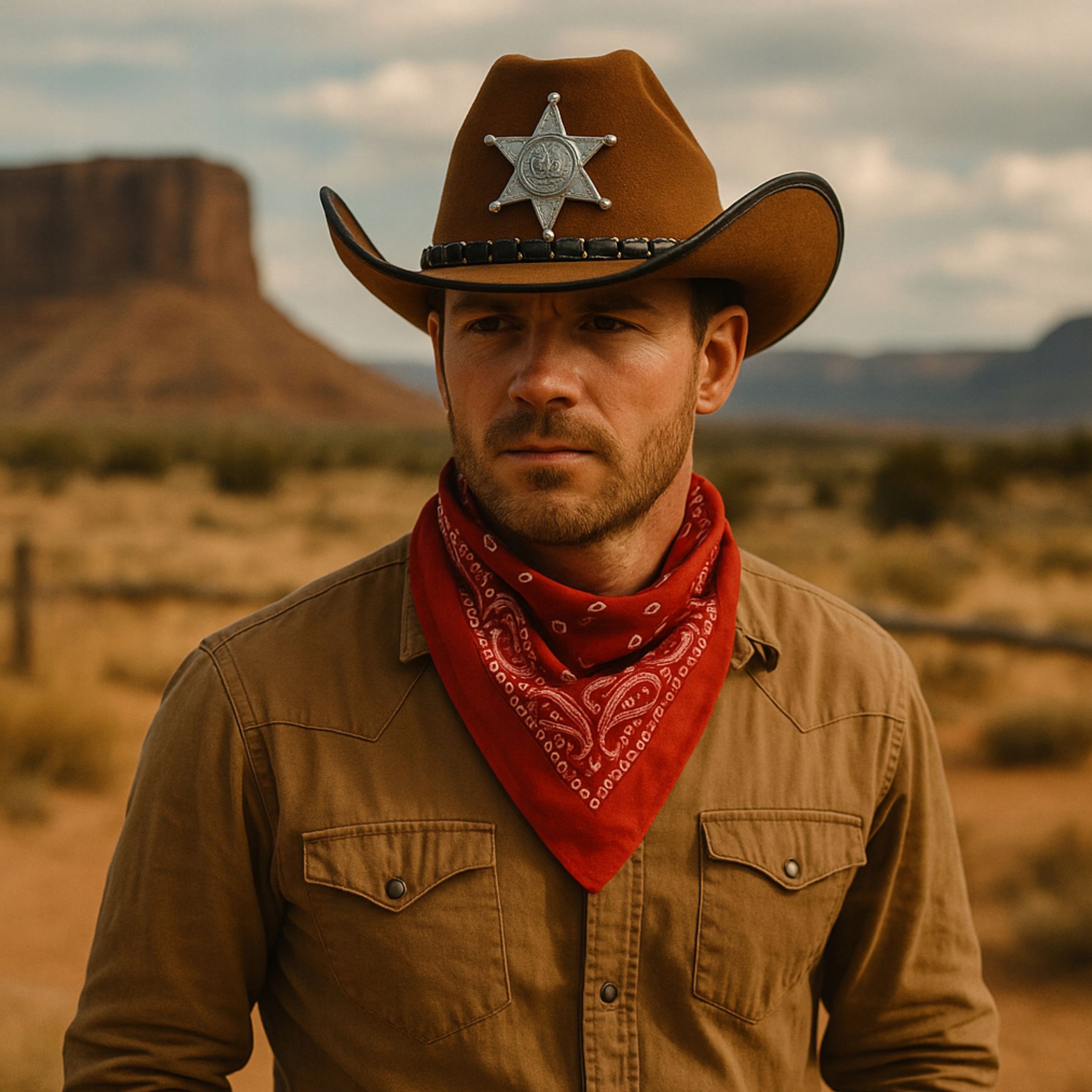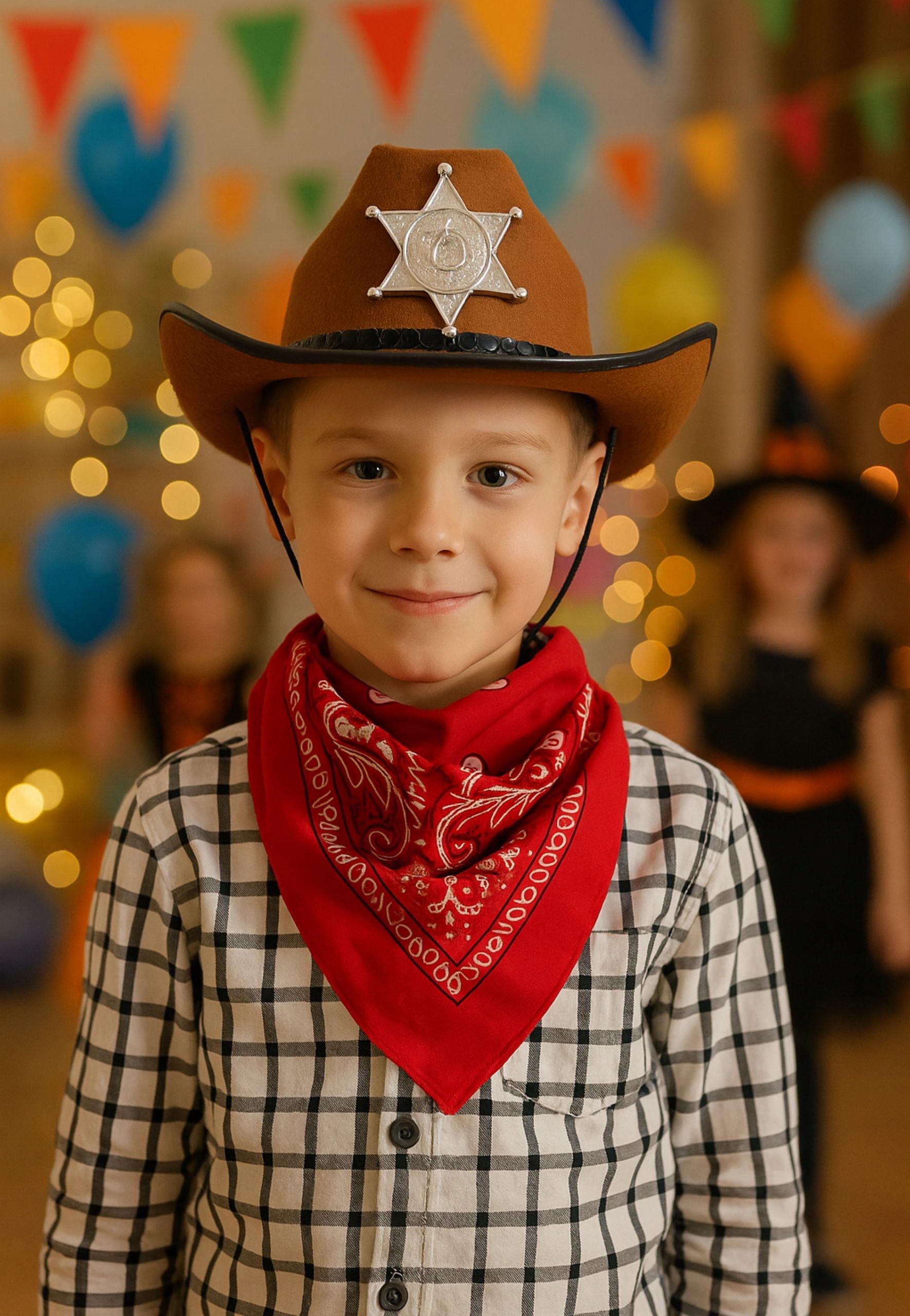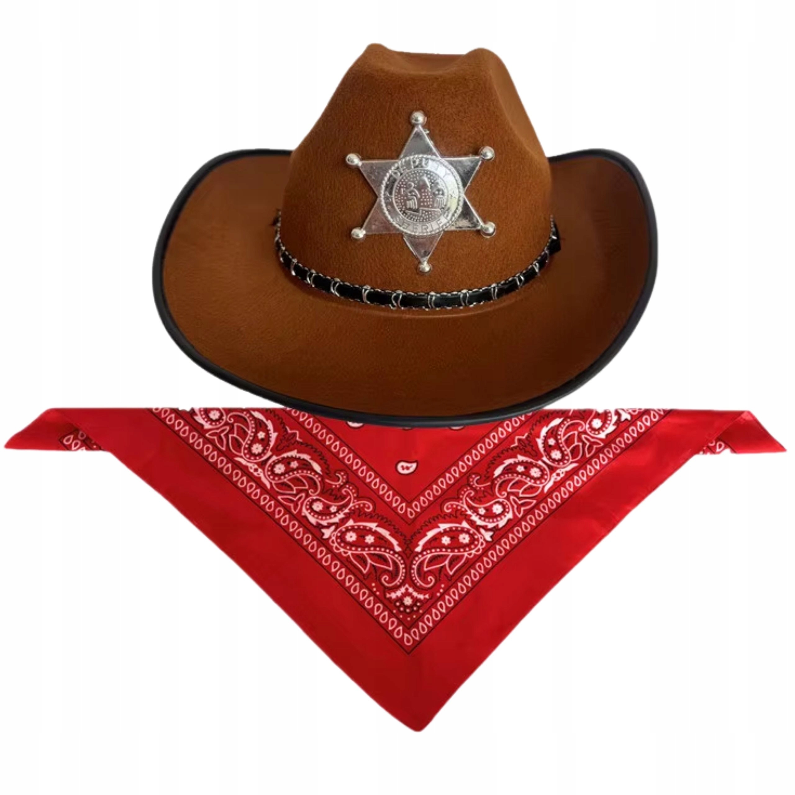 - Полный комплект - ковбойская шляпа со значком шерифа и классический шарф в одном.