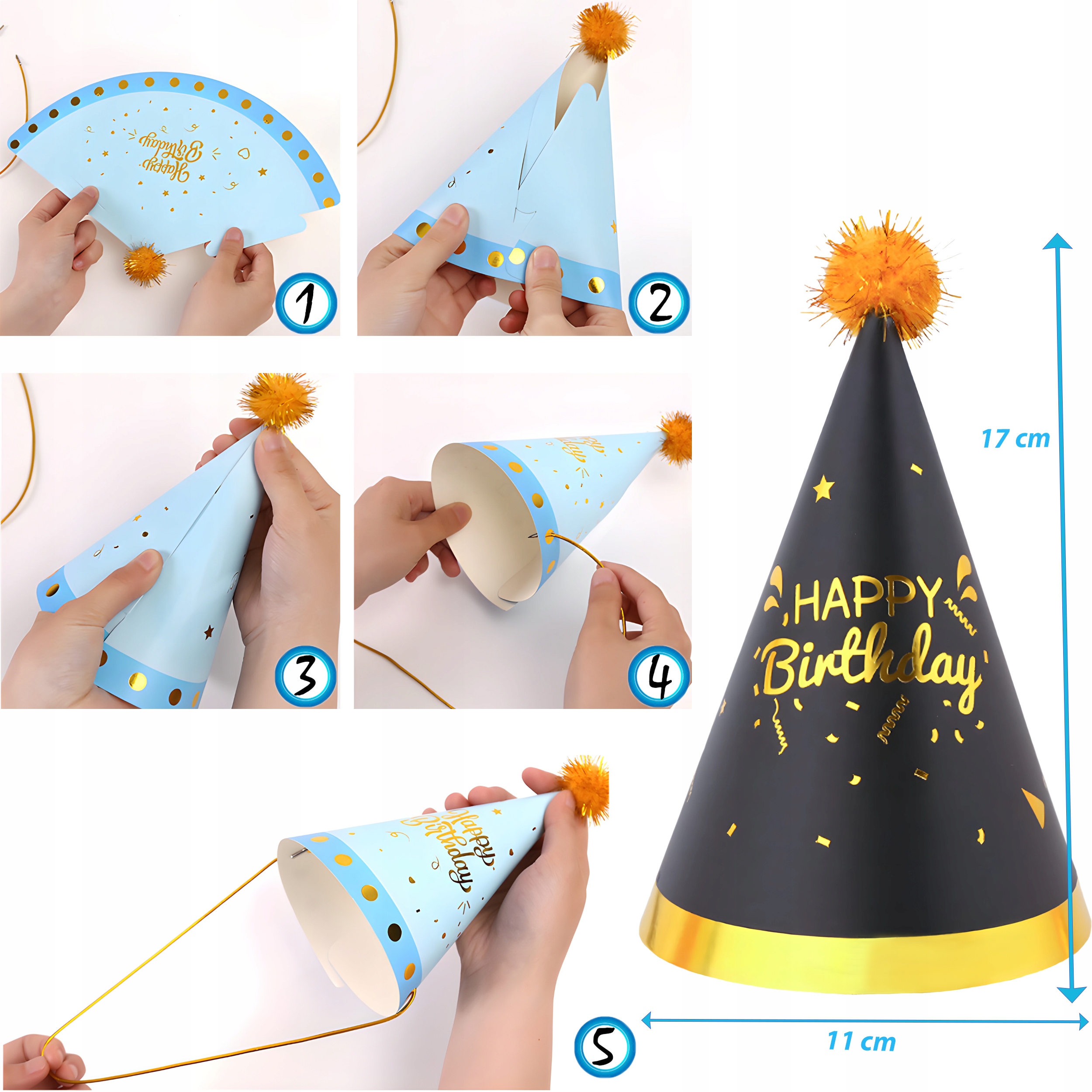 Каждая шляпа украшена блестящей золотой надписью «С Днем Рождения» и элегантным золотым ободом, который прекрасно отражает свет. На вершине есть апельсиновый помпон - веселый и декоративный акцент.