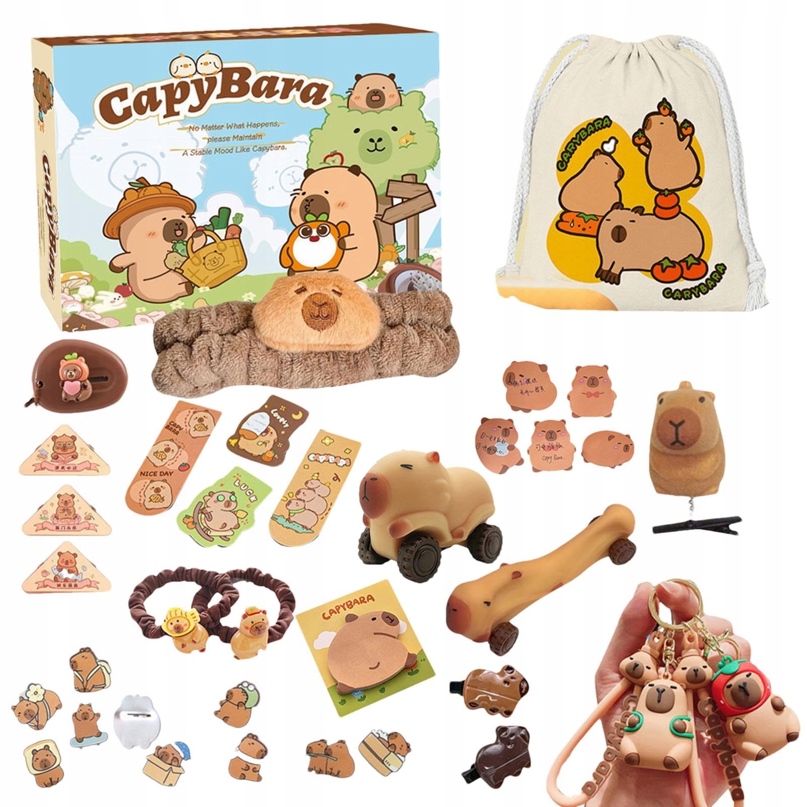 🟢 TНабор слепых слепков Capybara обратного отсчета из 24 предметов включает в себя широкий выбор аксессуаров: фигурки, брелки, браслеты, подвески, заколки для волос, резинки для волос, носки, наклейки и ожерелье - в комплект также входит подарочный пакет. Функция обратного отсчета делает распаковку увлекательной и идеально подходит для коллекционеров и любителей милых животных.