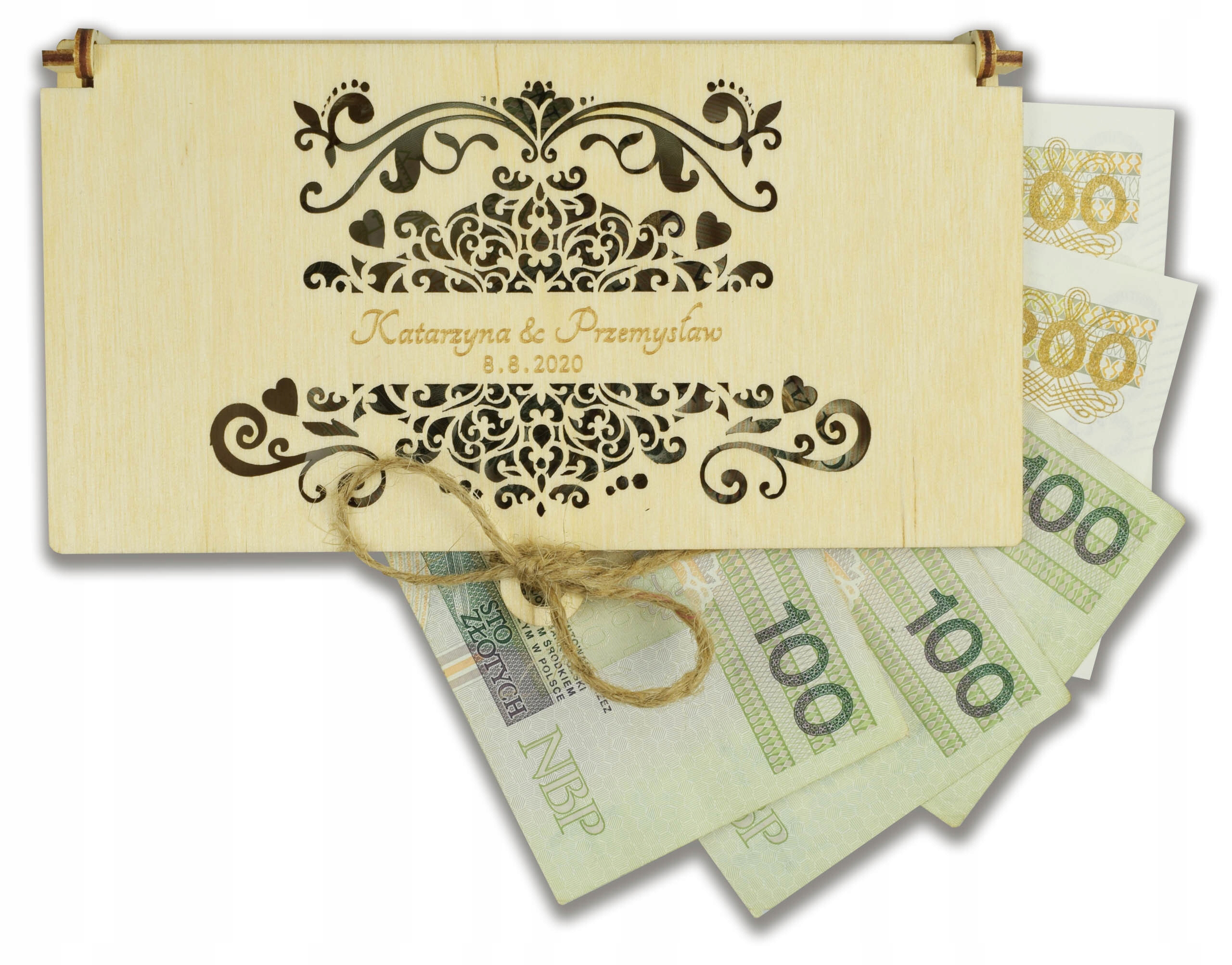 Персонализированная коробка выполняет две функции. Это стильный футляр для банкнот, а выгравированные на нем пожелания заменяют обычную открытку.
