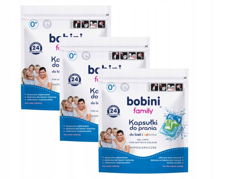 Линия Bobini Family была создана для всей семьи. Гипоаллергенные капсулы идеально подходят для детской одежды, поскольку обеспечивают нежность нежной коже новорожденных и маленьких детей, но также отлично подходят для стирки одежды взрослых, в том числе с чувствительной и склонной к аллергии кожей. Капсулы полностью растворимы и легко смываются. Их можно использовать с первых дней жизни.