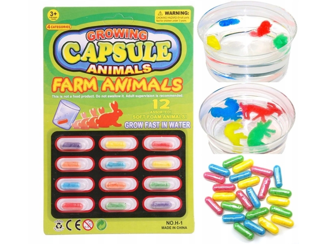 Волшебные капсулы представляют собой таблетки продолговатой формы, которые , после погружения в воду, вылупляются различные сельскохозяйственные животные в виде мягких губок.
