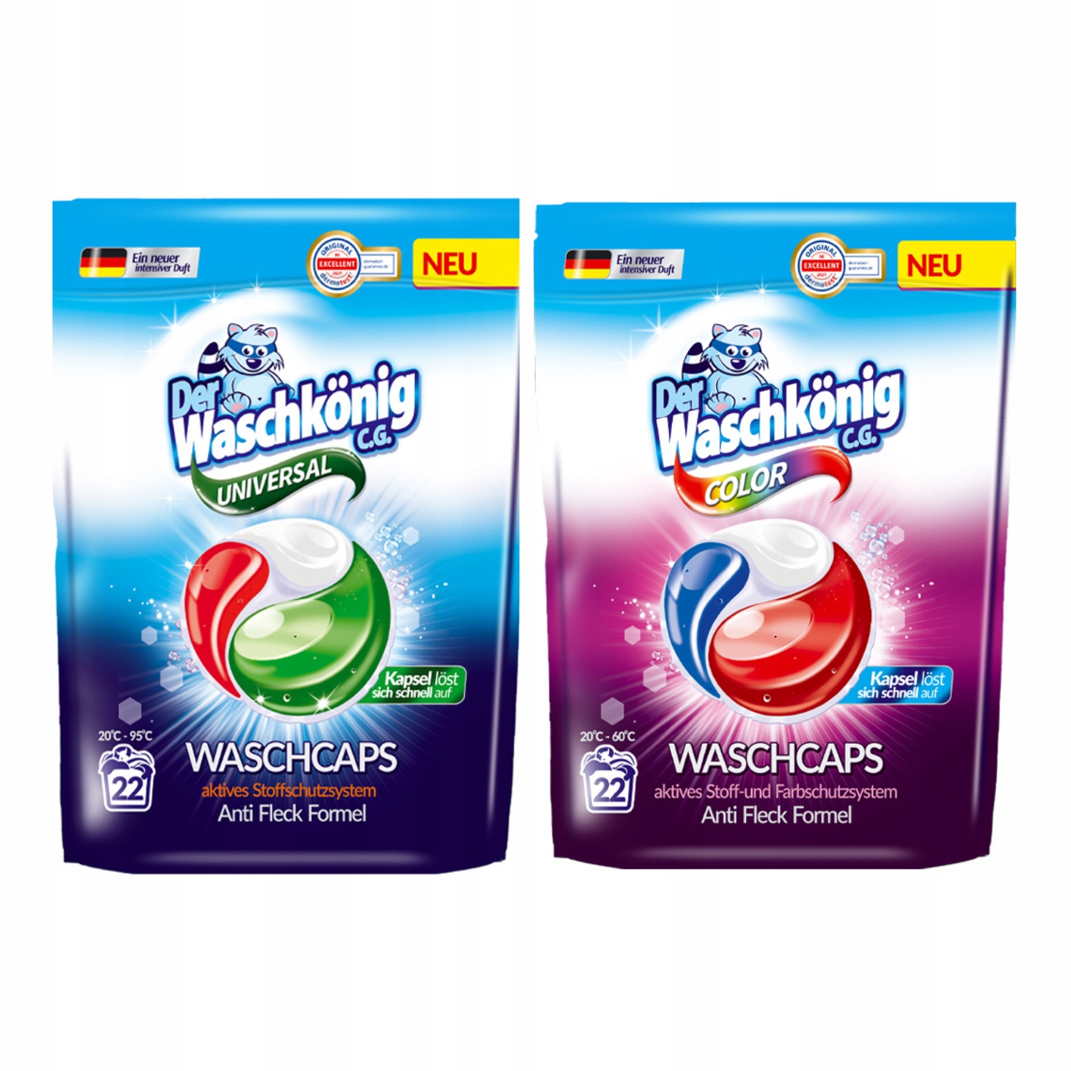 Трехкамерные гелевые капсулы Der Waschkönig Universal подходят для стирки как цветных, так и белых тканей.