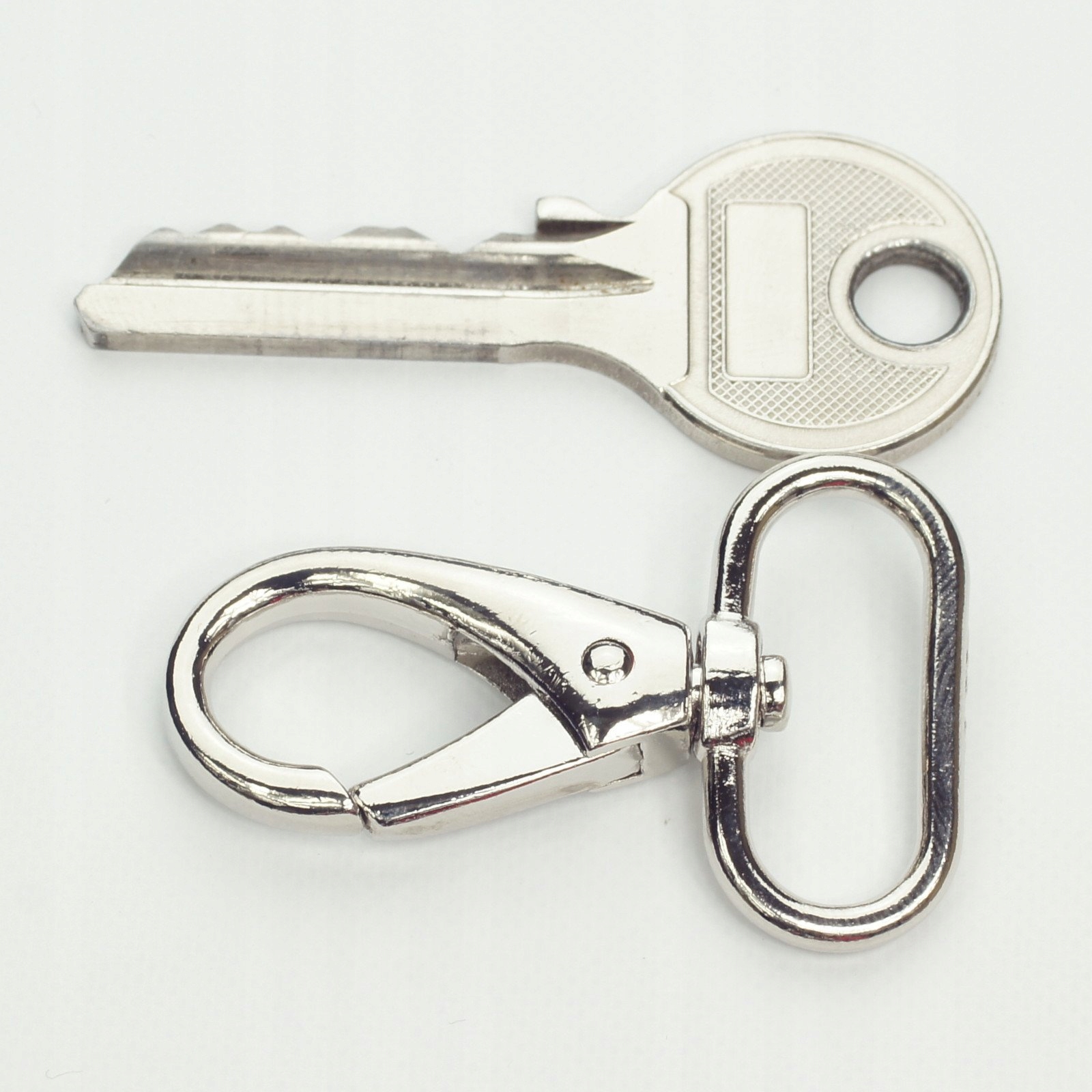 Карабины с рычагом и внутренней пружиной, вращательно соединенные с овалом. Длина набора составляет около 48 мм. Зазор проушины составляет около 25 мм. Изделие изготовлено из никелированного металла серебристого цвета.