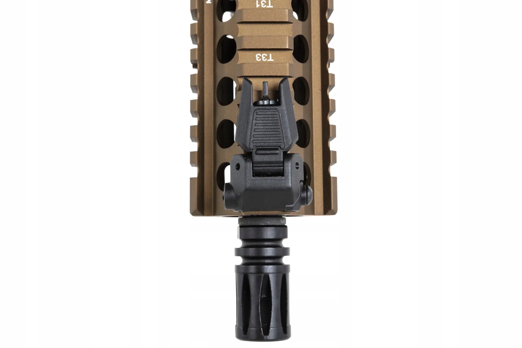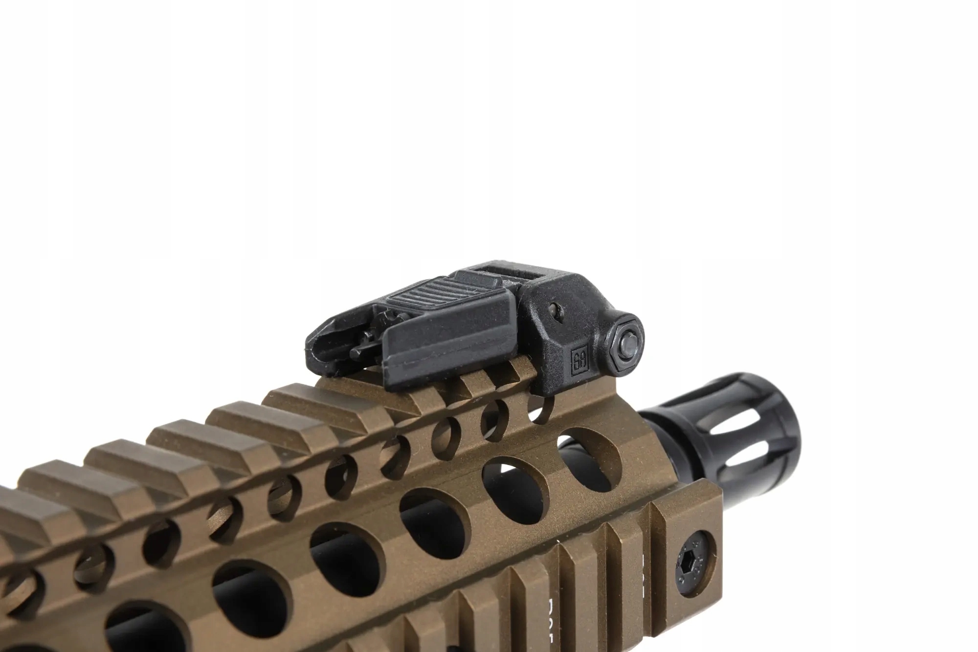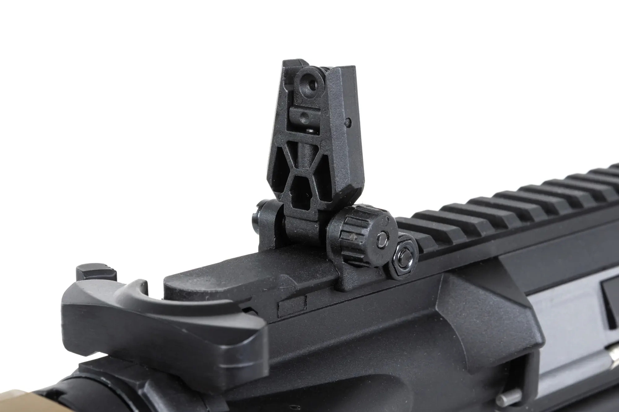 Копия карабина SA-C19 оснащена передней планкой в системе крепления RIS22мм. Ствол комплектуется стандартным дульным устройством, крепящимся на резьбу против часовой стрелки 14мм. На задней части реплики имеются складные прицельные приспособления.
