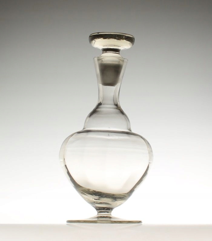 Кольцо бледного осадка внизу брюха. По краю заливной горловины имеются две плоские микровмятины: ок. 2 мм и ок. 3 мм, а также мелкие неровности, которые больше заметны под кончиком пальца, чем видны. Край основания без сколов. Ножка пробки имеет микроповреждения ок. 2 мм, видно на фото. Стеклянный выступ на стыке брюшка и основания диска виден примерно на половине диаметра короткой шейки. Из-за этого днище графина слегка наклонено в сторону, но это видно не в каждом положении. Несколько следов использования на днище, пробке и многом другом на базовом диске. Стеклянная масса не белоснежная.