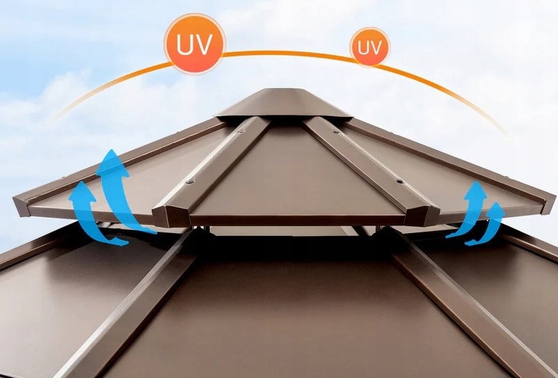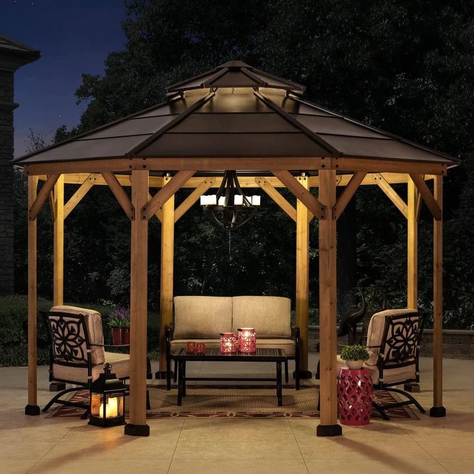 Спроектируйте свою гостиную на открытом воздухе и создайте оазис посреди сада. Восьмиугольная беседка Sunjoy размерами 395 х 395 см поможет вам защитить ваших детей и друзей от сильного солнца или дождя. Оставайтесь защищенными от солнца под двухэтажной вентилируемой крышей, поддерживаемой нержавеющим каркасом из кедра и устойчивой к ржавчине коричневой стальной панелью крыши с порошковым покрытием. Прикрепите любимую люстру или светильник на встроенный в потолок крючок, который придаст беседке законченный вид и красивый дизайн. Беседка имеет двойную систему рельсов для крепления противомоскитных сеток и штор (не входят в комплект).