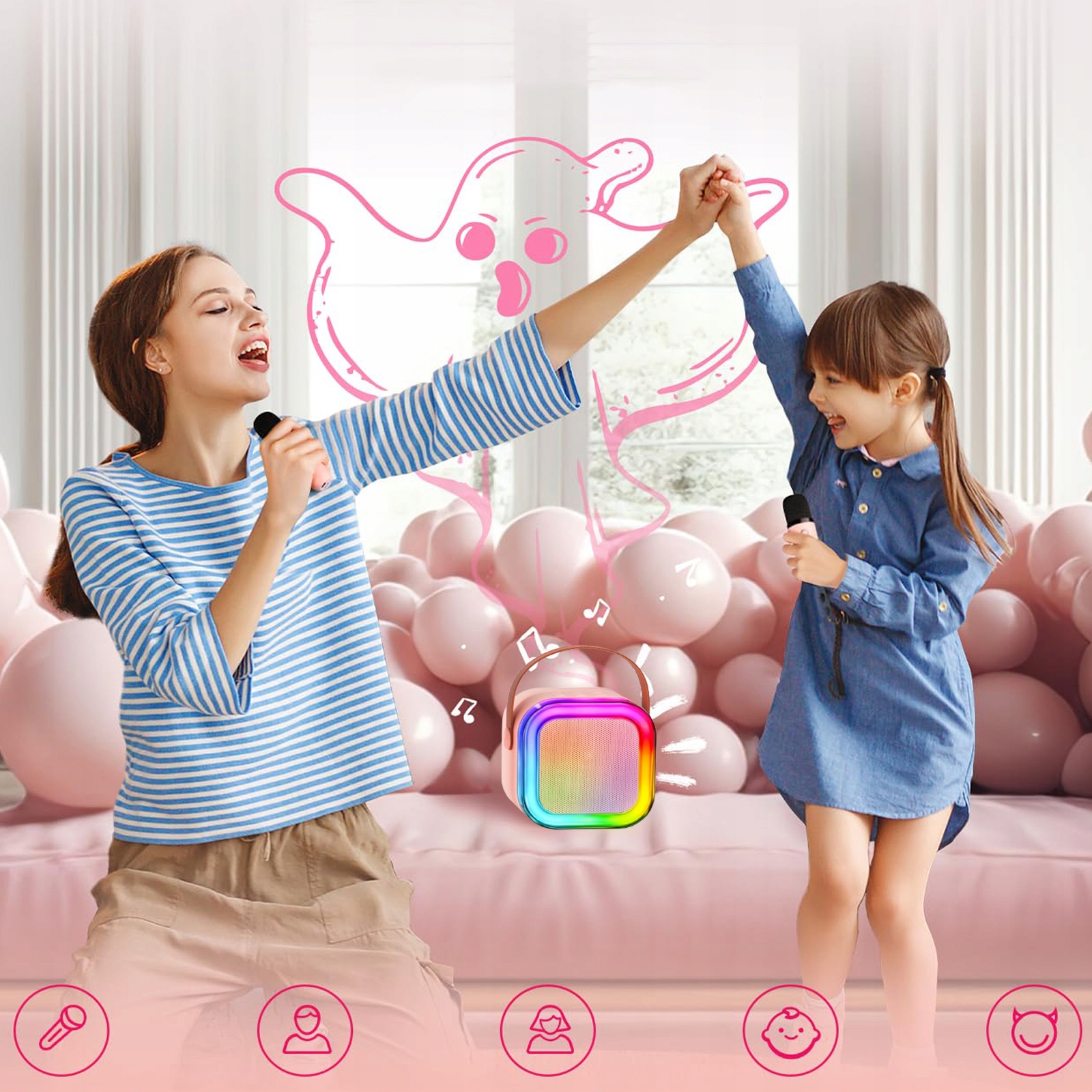 🎤 Мини -динамик имеет 3 режима светодиодного освещения (третий режим активируется только при воспроизведении музыки). Этот продукт может быть отличным оборудованием для взрослых караоке, он компактен для небольших детей. p>
