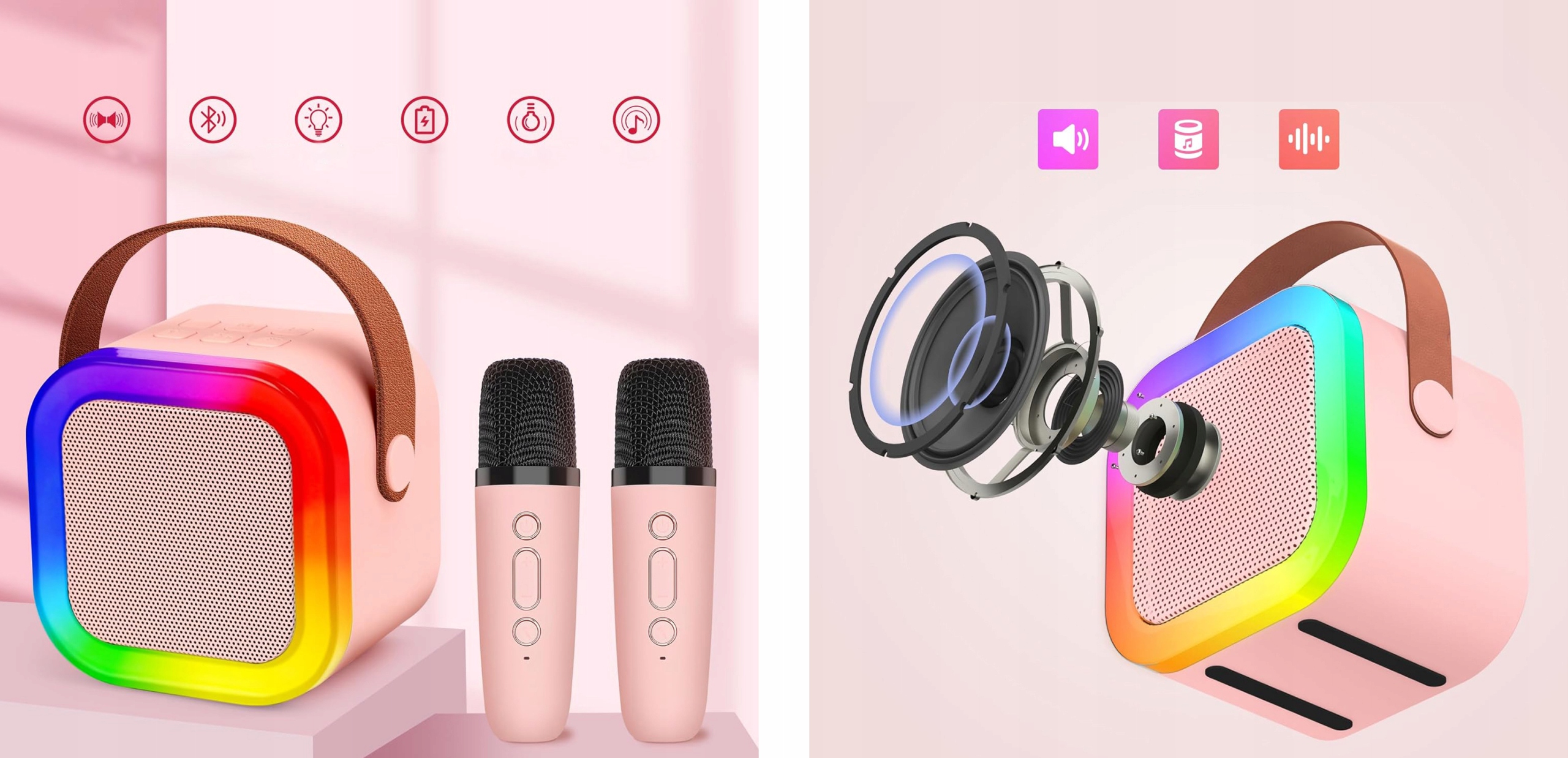 🎤 Длина беспроводного микрофона составляет 13,5 см, он маленький, легкий и прост в захвате для детей и взрослых. Размер динамика Bluetooth составляет 8,3 х 6,2 х 8,5 см, что означает, что он действительно портативный. Его можно использовать в качестве путешественника и легко поместить в туристическую сумку или чемодан.