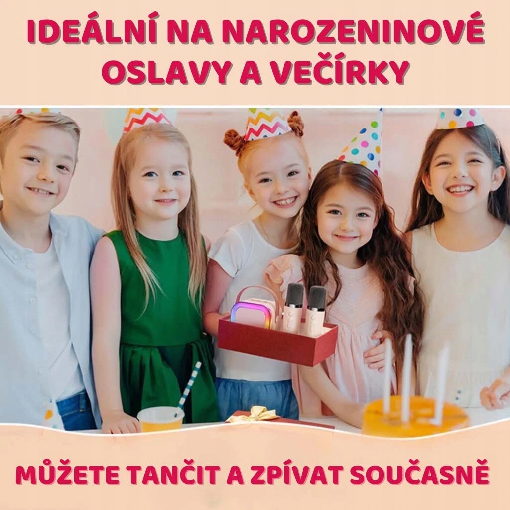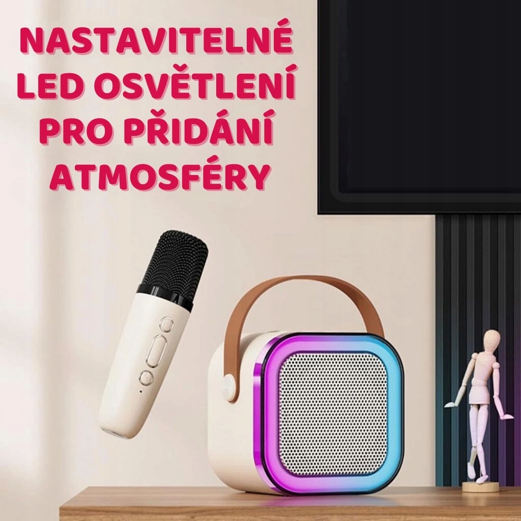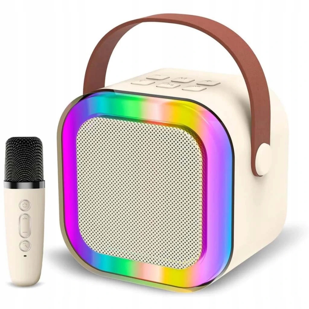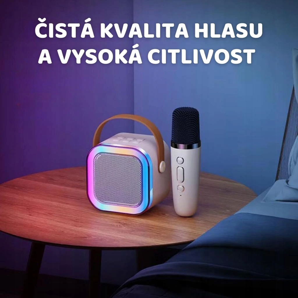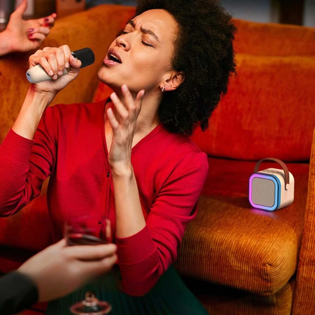 Стильный портативный мини -караоке набор с двумя беспроводными микрофонами - зарядка USB -C, до 6 часов воспроизведения, размеры: 8,6 x 8,6 x 6,6 см.
