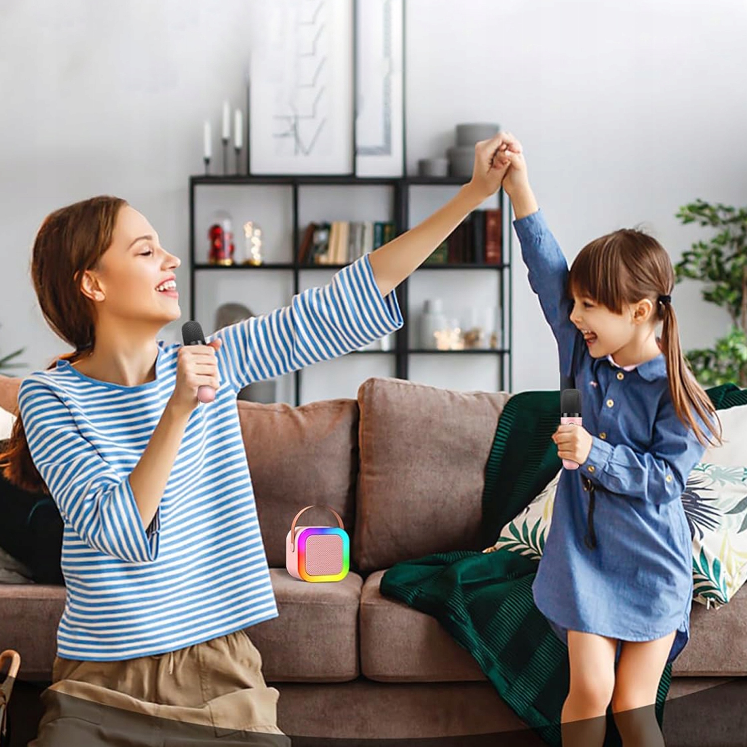 - 🎤 - 【3 режима светодиодной подсветки】: Мини-динамик имеет 3 режима светодиодной подсветки (третий режим активируется только при воспроизведении музыки). Этот продукт может стать отличным караоке-машиной для взрослых, он компактен для маленьких детей.