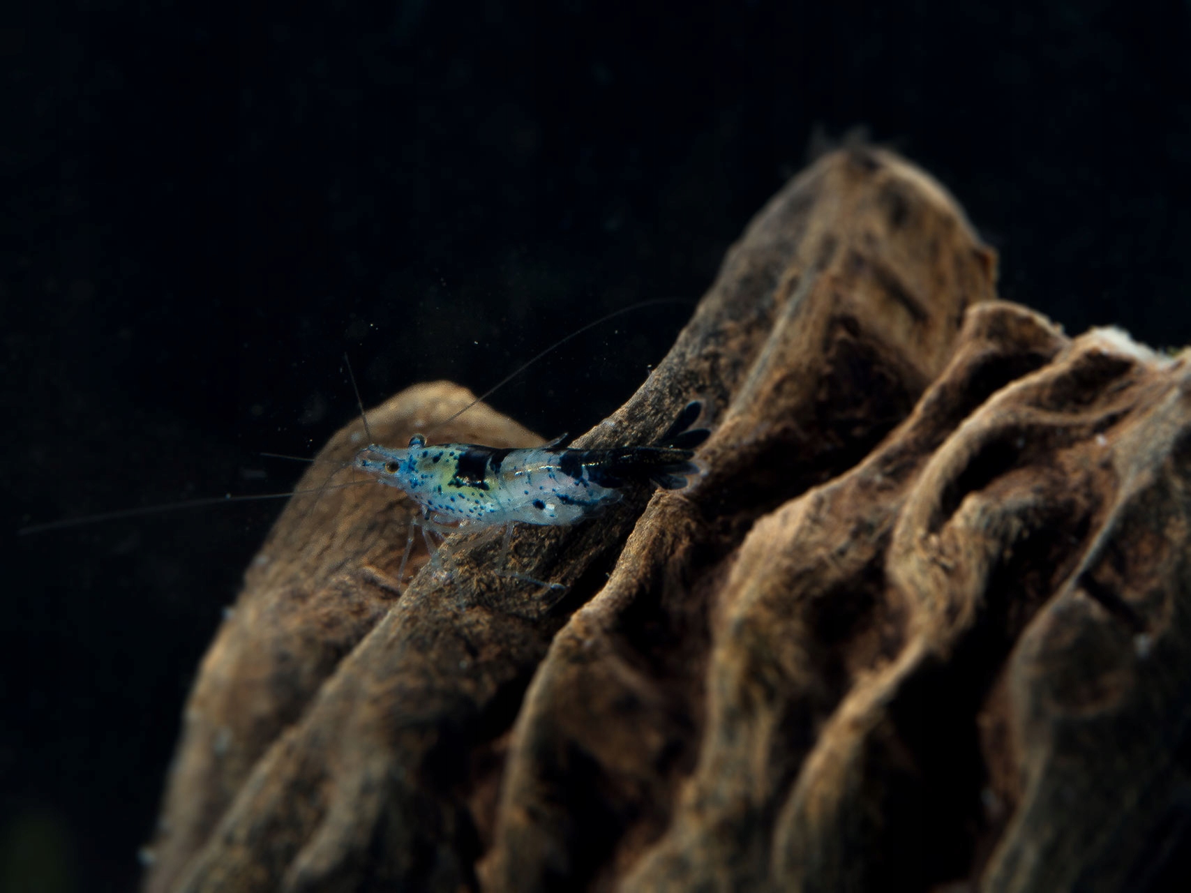 Описание:Креветка очень неправильной окраски. Креветки имеют различно расположенные пятна на теле темно-синего и темно-синего цвета на фоне слегка синего тела.
