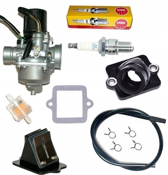 КАРБЮРАТОР 17,5мм + ВПУСКНАЯ ТРУБА + КЛАПАН PEBAL + ПРОКЛАДКА ДЛЯ КЛАПАНА PEBAL + ТОПЛИВНЫЙ ШЛАНГ 50см + ЗАЖИМЫ 4 шт. + ТОПЛИВНЫЙ ФИЛЬТР + ПРОБКА 14 NGK