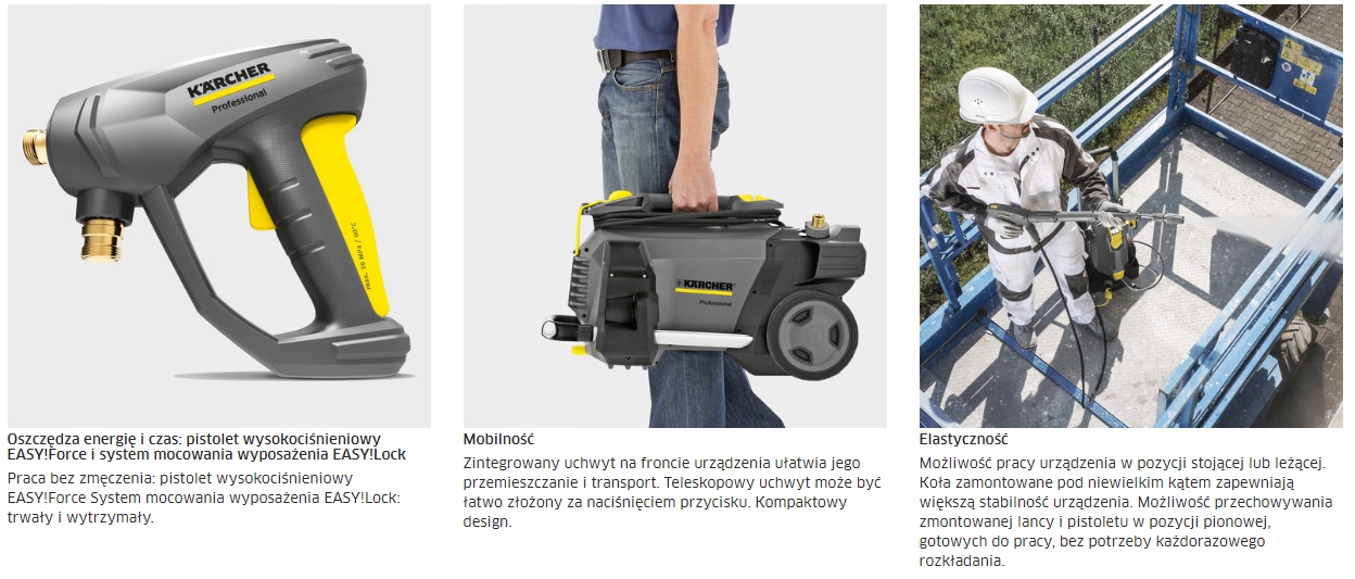 В стандартной комплектации пистолет высокого давления EASY!Force с вращающейся штангой, шланг высокого давления длиной 10 м и трехступенчатое сопло b>. Технология EASY!Force снижает силу, необходимую для удержания спускового крючка пистолета, до нуля. Кроме того, устройство оснащено системой крепления оборудования EASY!Lock, которая позволяет 5x заменять оборудование быстрее, чем традиционная система резьбы.