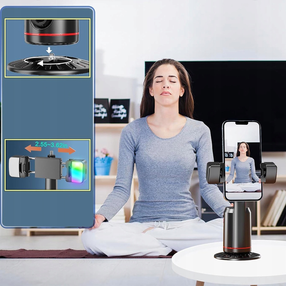- Это портативное крепление с автоматическим отслеживанием лица на 360 градусов имеет складную миниатюрную конструкцию, которая легко складывается и раскладывается для удобства транспортировки.
