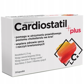 Кардиостатил плюс пищевая добавка включает монаколин K из ферментированного красного риса, а также 250 мг экстракта плодов бергамоты (цитрусовая бергамия), стандартизированные на полифенолах. Экстракт чеснока, содержащийся в продукте, помогает поддерживать нормальный уровень холестерина в крови и поддерживает здоровье сердца и кровеносных сосудов. Кроме того, продукт содержит витамин B6 и витамин B12, которые способствуют поддержанию надлежащего энергетического метаболизма и помогают поддерживать правильный метаболизм гомоцистеина. Композиция продукта была обогащена листьями артишока, которые обладают антиоксидантными свойствами. Он поддерживает правильное функционирование сердца и печени, а также способствует поддержанию нормального уровня липидов в крови. Кроме того, продукт содержит хром, который помогает поддерживать нормальный уровень глюкозы в крови и способствует поддержанию правильного метаболизма питательных макронутриентов. Кроме того, продукт включает в себя фолиевую кислоту, принадлежащую к Фолиану, которая поддерживает правильное функционирование иммунной системы, а также помогает в правильном производстве крови и правильном синтезе аминокислот. Li> Экстракт красного риса Oryza sativa, ферментированная монаскью Purpureus 55 мг, включая монаколин K 2,75 мг