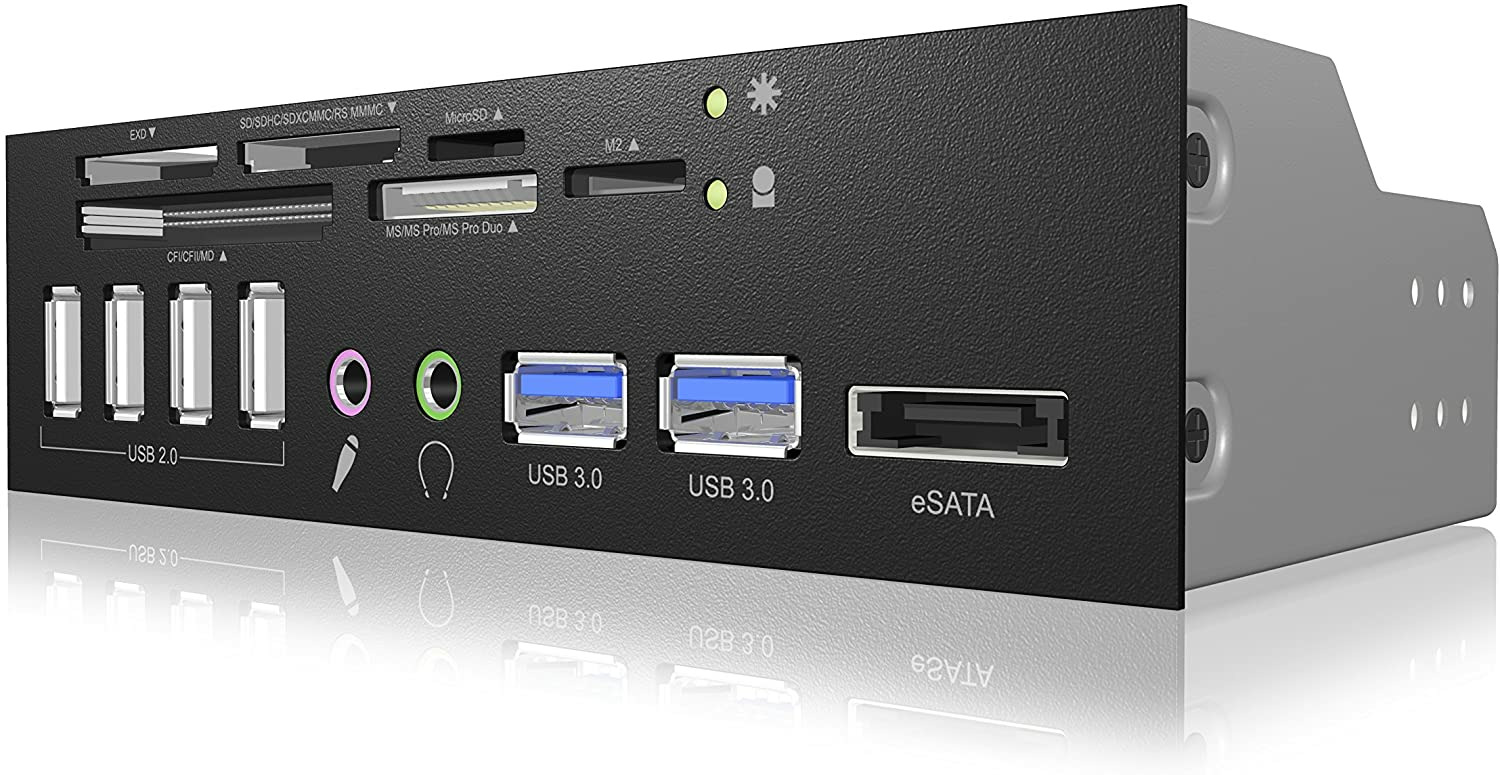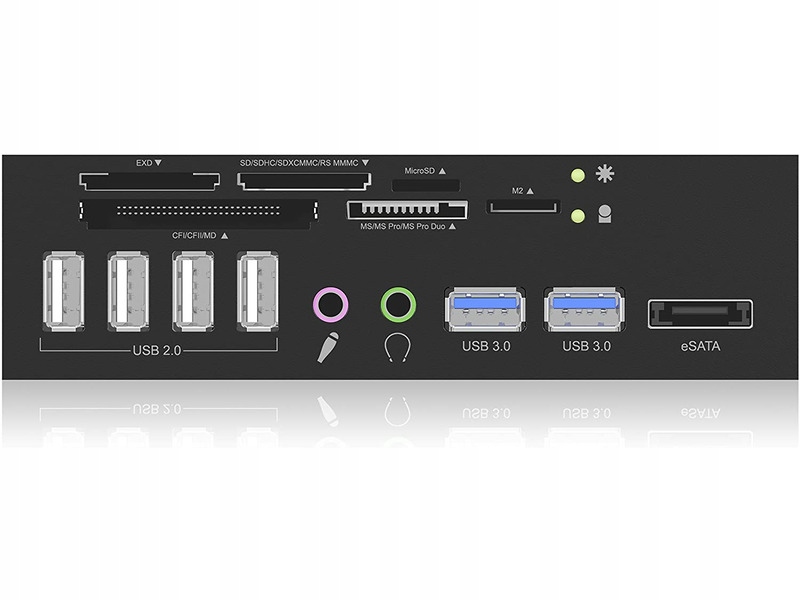 Благодаря нашему усовершенствованному устройству чтения карт памяти вы можете подключать к компьютеру бесчисленное множество устройств. Он читает 60 различных карт памяти, имеет 2 разъема USB 3.0, обеспечивающие отличную скорость передачи данных, 4 порта USB 2.0 и разъем e-SATA. Кроме того, он имеет разъемы для наушников и микрофона.