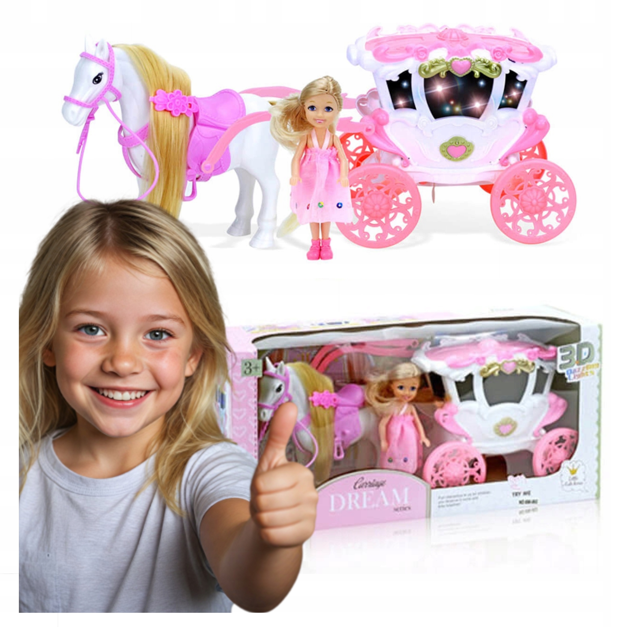 KARETA Z KONIKIEM I LALKĄ RÓŻOWA ŚWIECI GRA ZESTAW DLA DZIEWCZYNEK