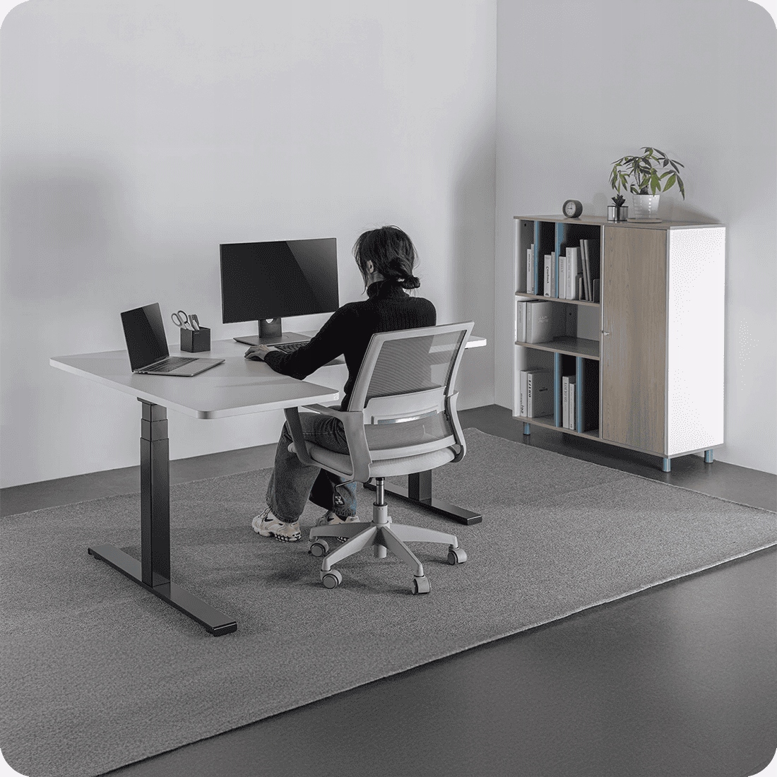 Регулировка высоты — идеальное решение, когда на одном рабочем месте работают несколько человек — регулируйте высоту столешницы под рост каждого пользователя.